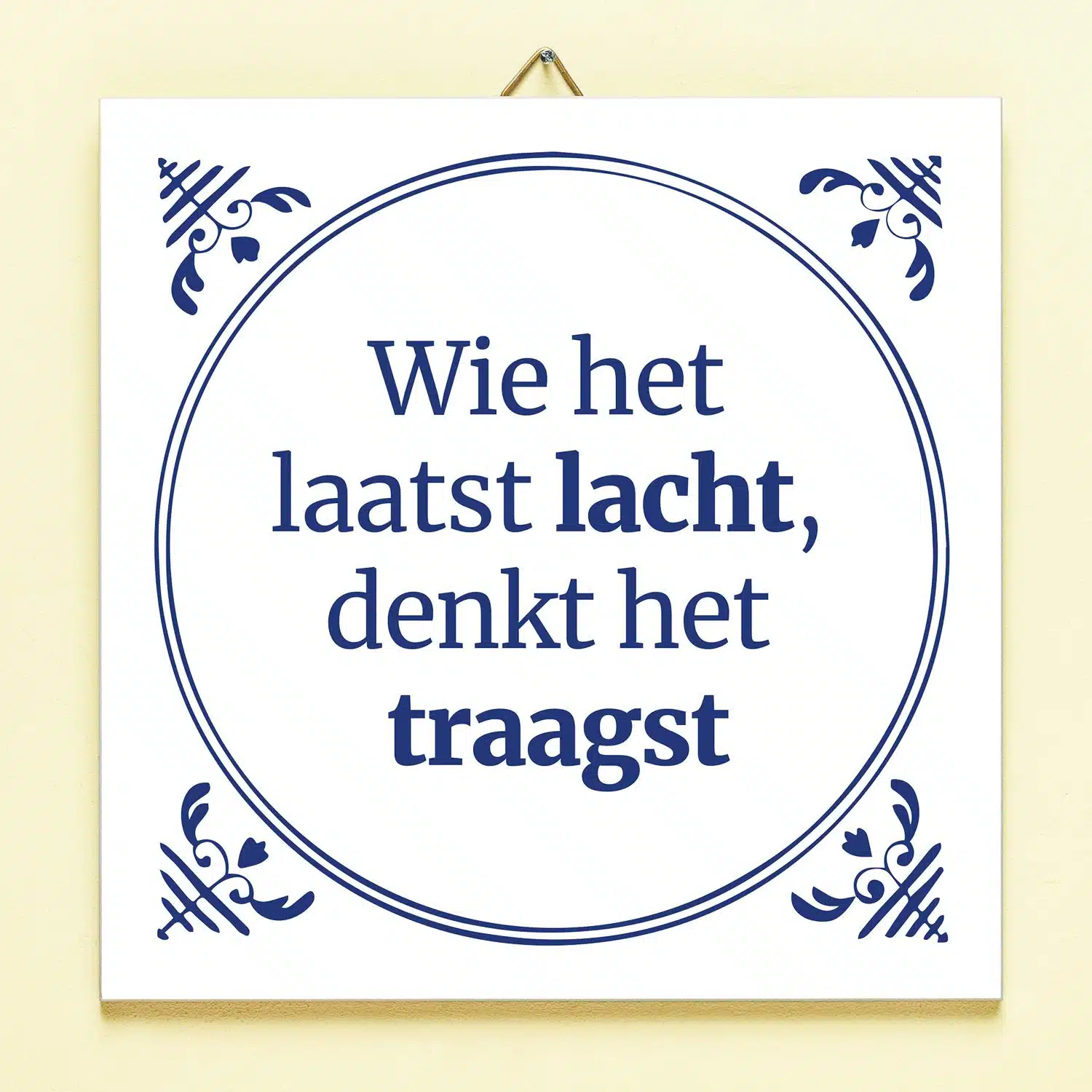Lach jij het best of ben je gewoon een beetje traag van begrip? Volgens het Tegeltje Wie het laatst lacht, is het het laatste. Op dit tegeltje, geïnspireerd op de oude Delfts blauwe tegeltjes, staat de tekst: Wie het laatst lacht, denkt het traagst. Een grappig cadeautje om aan een vriend te geven.