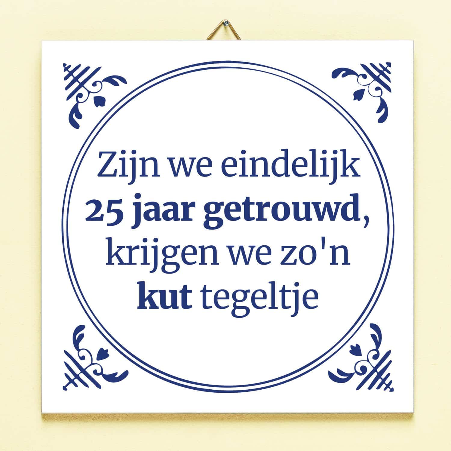 Een houten huwelijk moet gevierd worden! Net zoals je tinnen huwelijk, koperen huwelijk en natuurlijk het zilveren huwelijk. Voor al deze speciale mijlpalen hebben wij een grappig cadeau: het Tegeltje Zijn we eindelijk zoveel jaar getrouwd. Op het tegeltje staat de tekst: Zijn we eindelijk 5 jaar getrouwd, krijgen we zo’n kut tegeltje. De tegel is leverbaar in verschillende varianten met andere jaren.