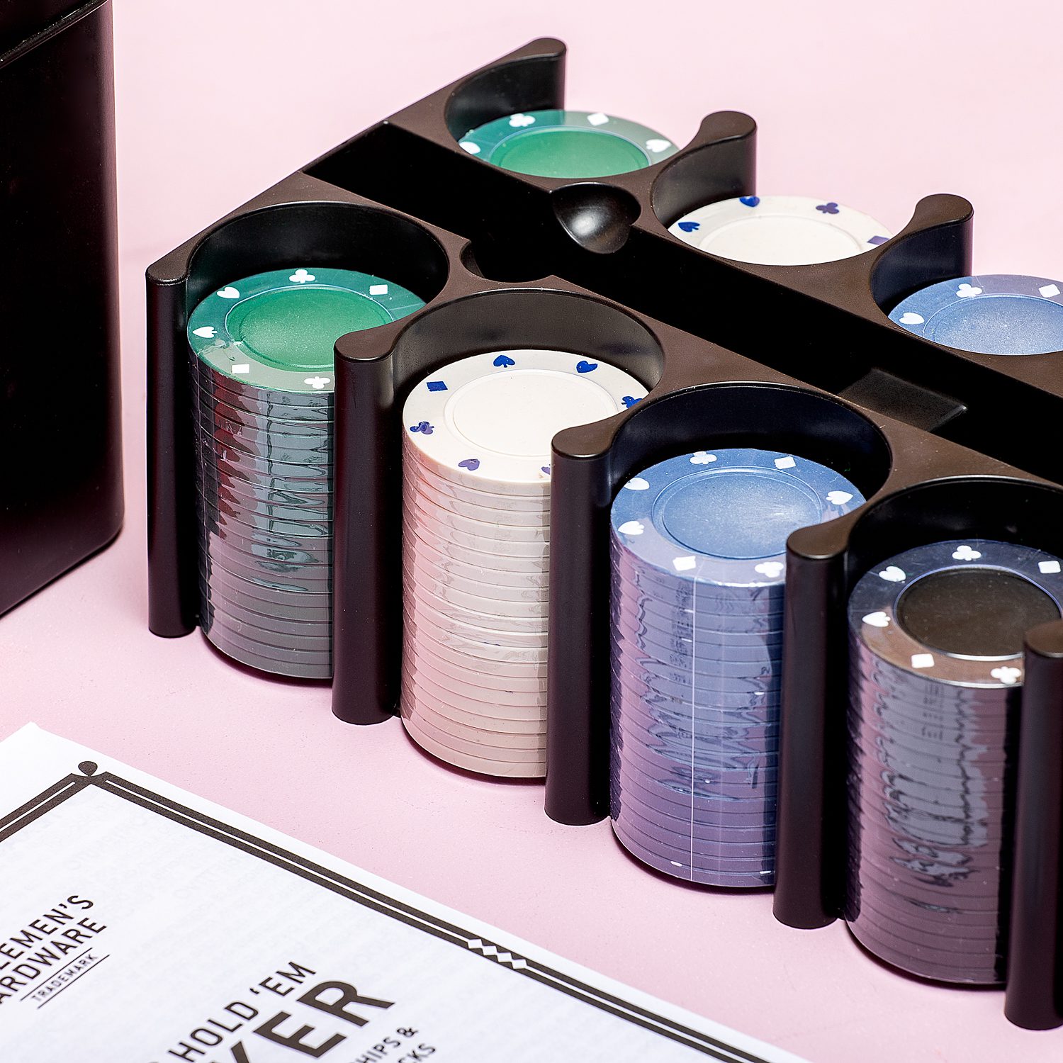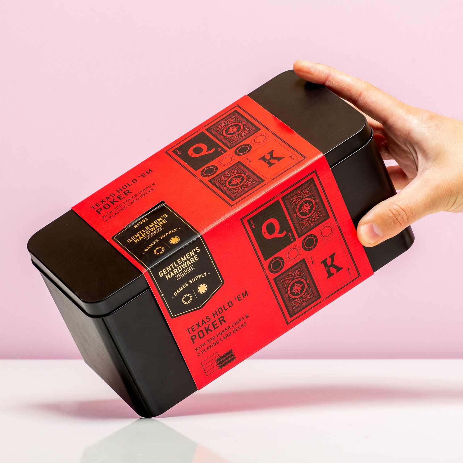 Zin in een lekker spelletje terwijl je in een hutje op de hei verblijft? Of gewoon in een potje poker bij de buren? Met het Texas Hold ‘Em Poker in blik van Gentlemen’s Hardware heb je alles bij je om te pokeren. In dit handige zwarte blik zitten 200 pokerchips, twee sets speelkaarten, een dealer munt en een big blind- en small blind munt. Natuurlijk zitten de spelregels er ook bij, zodat je zeker weet dat je het spel goed speelt.