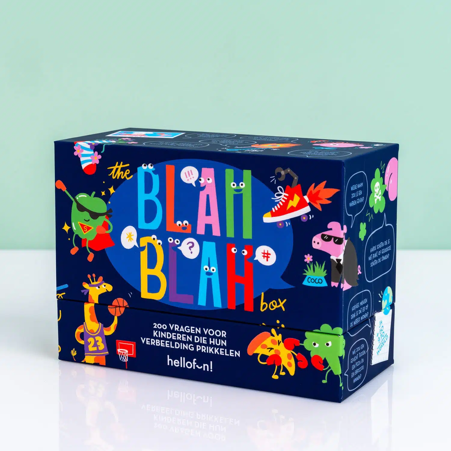 Verrassende vragen die ongetwijfeld net zulke verrassende antwoorden opleveren: de The Blah Blah Box (Nederlandse editie) van Hellofun! zit er vol mee. In deze box zitten tweehonderd vragen voor kinderen. De helft van de vragen is creatief, zoals: met welk dier zou jij willen praten en wat wil je het vragen? De andere vragen hebben een nieuwsgierige insteek, zoals: wat is volgens jou het saaiste wat volwassenen doen? Met dit spel leer je de creatieve geest van je kind, zusje of neefje kennen.