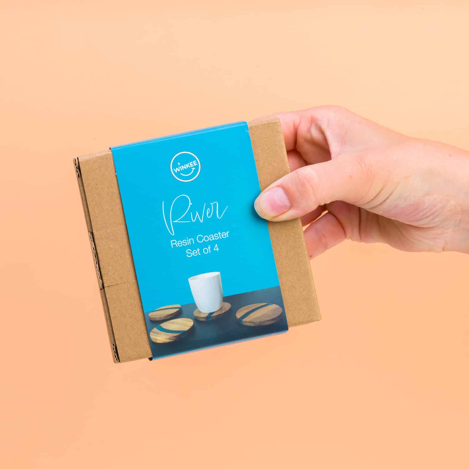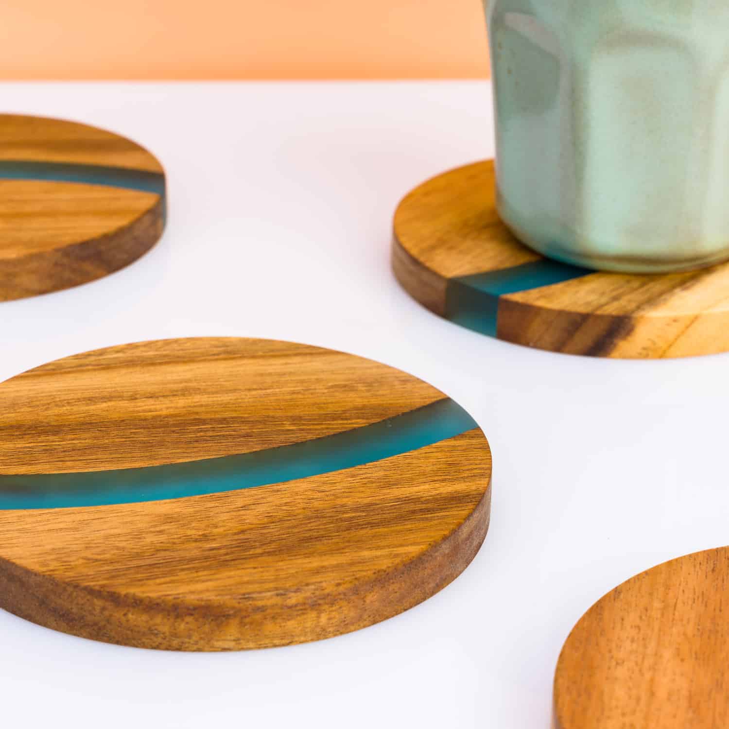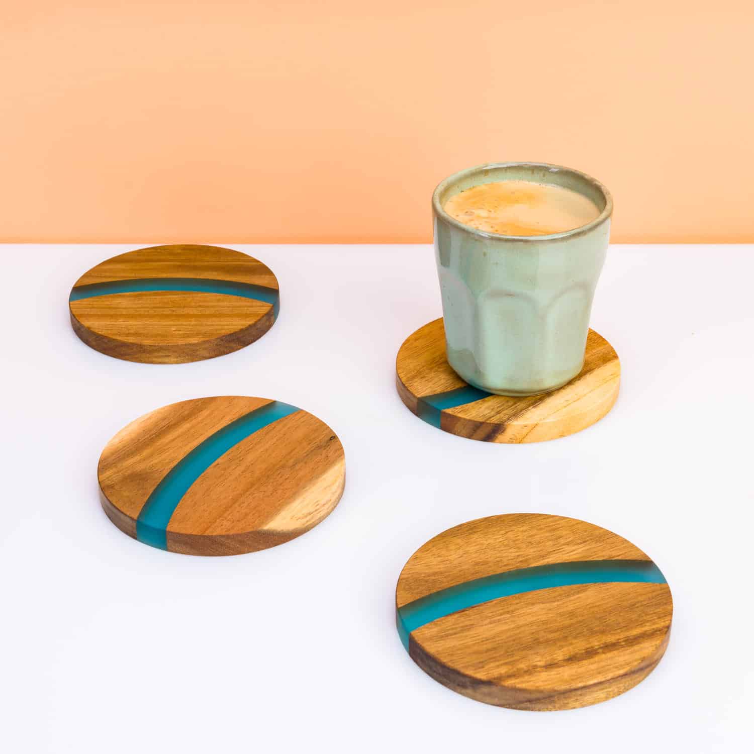 Set van vier onderzetters, waar een blauwe rivier doorheen lijkt te stromen. De onderzetters zien er niet alleen mooi uit, maar beschermen je tafel ook tegen krassen en kringen.