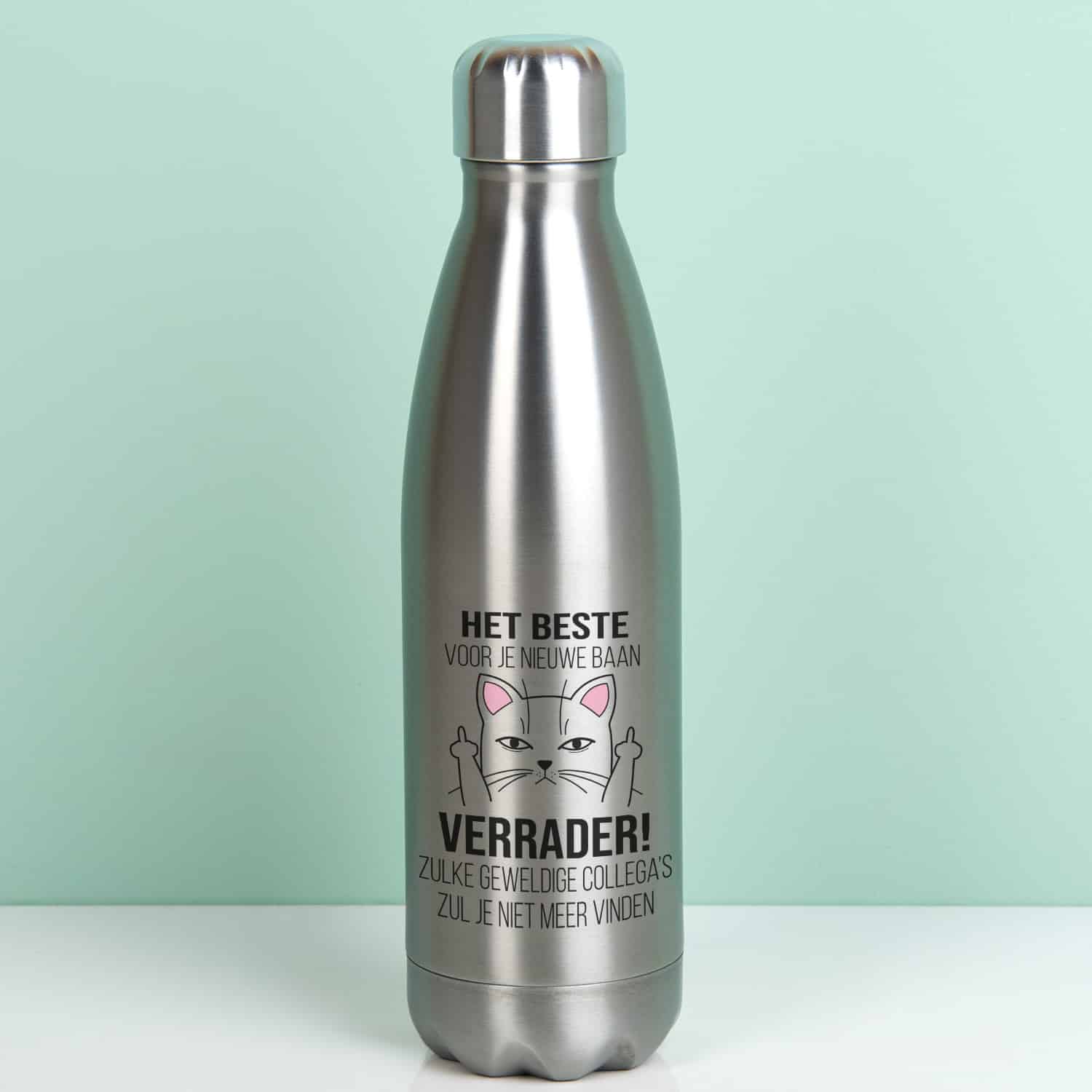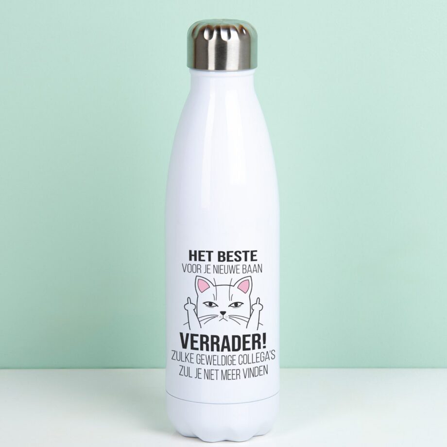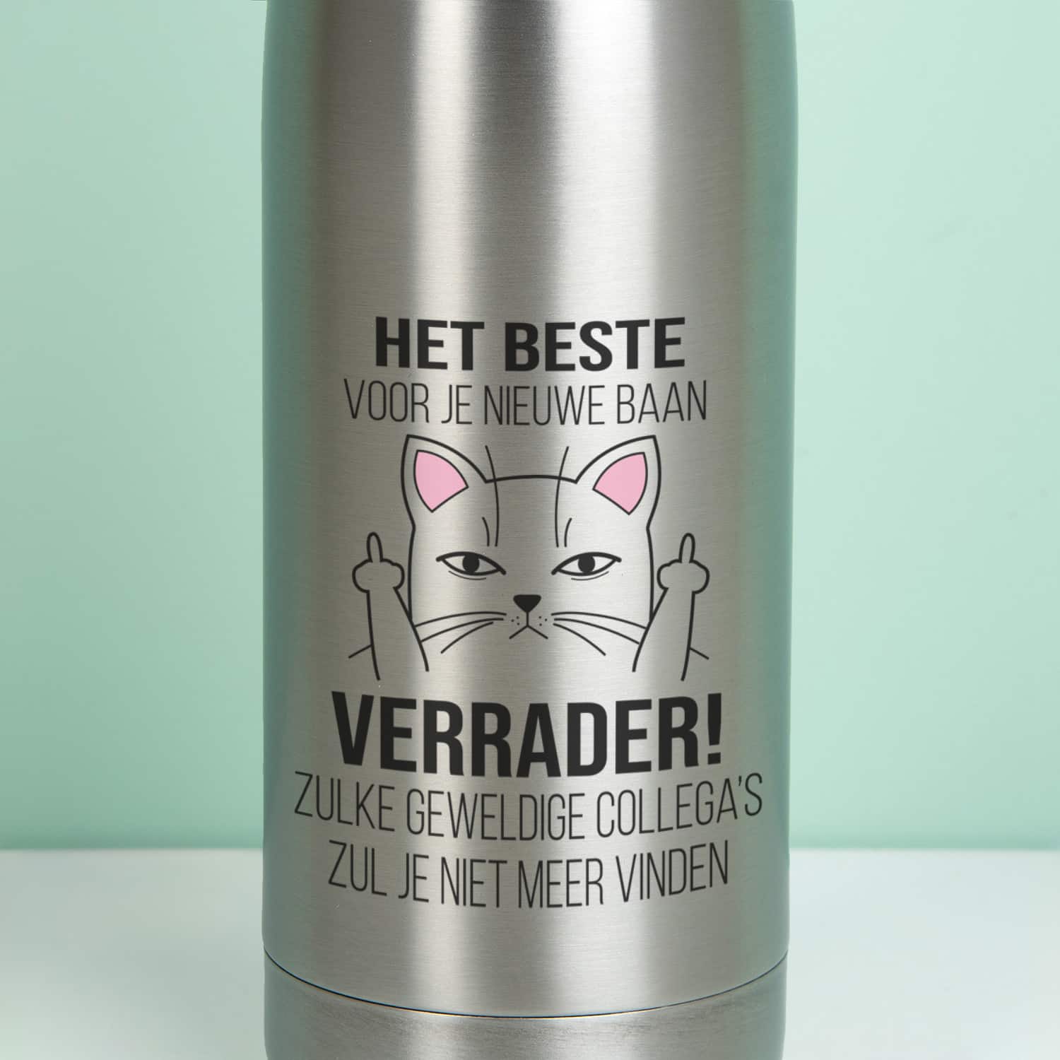 Het is altijd zuur om afscheid te nemen van een leuke collega. De Thermosfles Het beste voor je nieuwe baan maakt duidelijk hoe jij over de nieuwe baan van hem of haar denkt. Op deze praktische thermosfles staat een kat die zijn middelvingers opsteekt. Daarbij staat de tekst: Het beste voor je nieuwe baan. Verrader! Zulke geweldige collega’s zul je niet meer vinden. Een praktische thermosfles die dranken 12 uur warm en 24 uur koel houdt. Makkelijk om mee te nemen naar zijn of haar nieuwe werkplek!