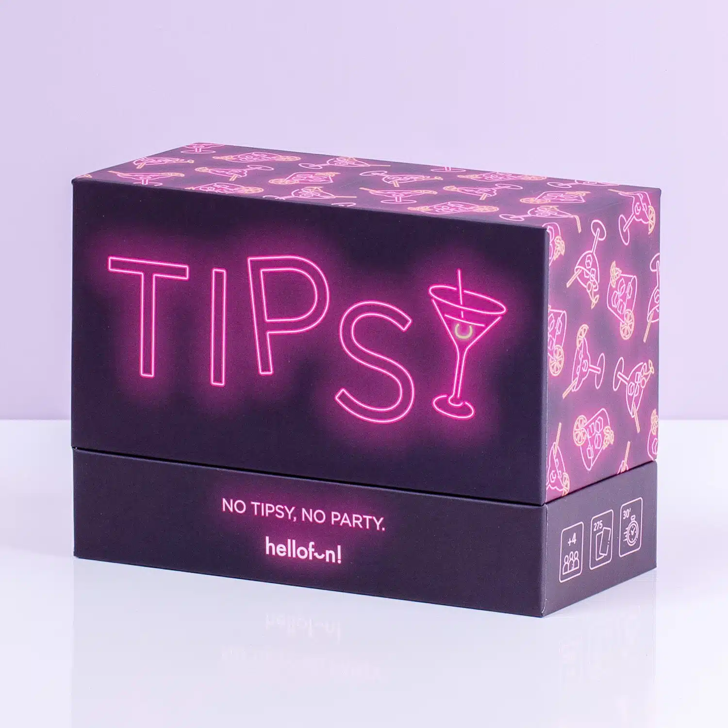No Tipsy, no party. Dat is het motto van het Tipsy drankspel (Engelse editie) van Hellofun!. Een grappig drankspel, wat je met drank overgoten avonden met vrienden nog leuker maakt. Het spel bestaat uit 270 kaarten met vragen en opdrachten, die je met minimaal vier vrienden moet beantwoorden en uitvoeren. Voel je je tipsy? Dan doe je het goed!