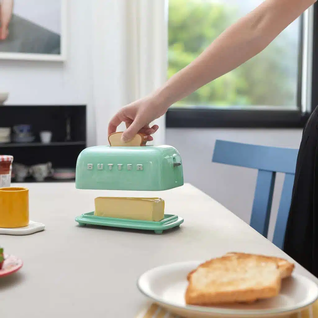 De Toasty botervloot van Balvi lijkt op een mini-broodrooster van een iconisch merk en heeft een sneetje toast als handvat. Deze groene keramische botervloot houdt je boter op kamertemperatuur romig of juist koel in de koelkast. Super schattig om op tafel of op het aanrecht te zetten en zo heb je altijd zachte roomboter bij de hand. Deze botervloot is het perfecte cadeautje voor iedereen die houdt van mooie keukenaccessoires.