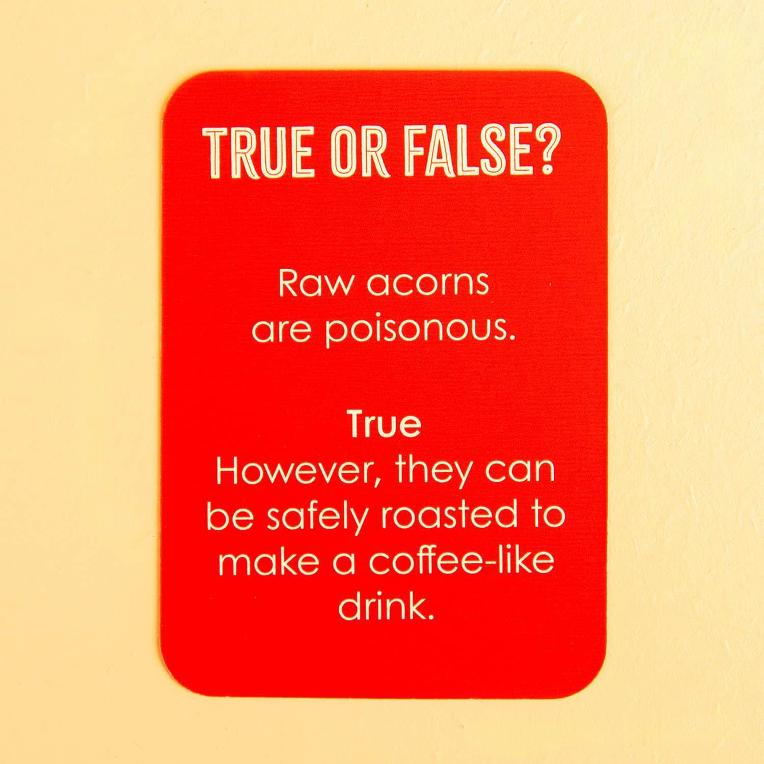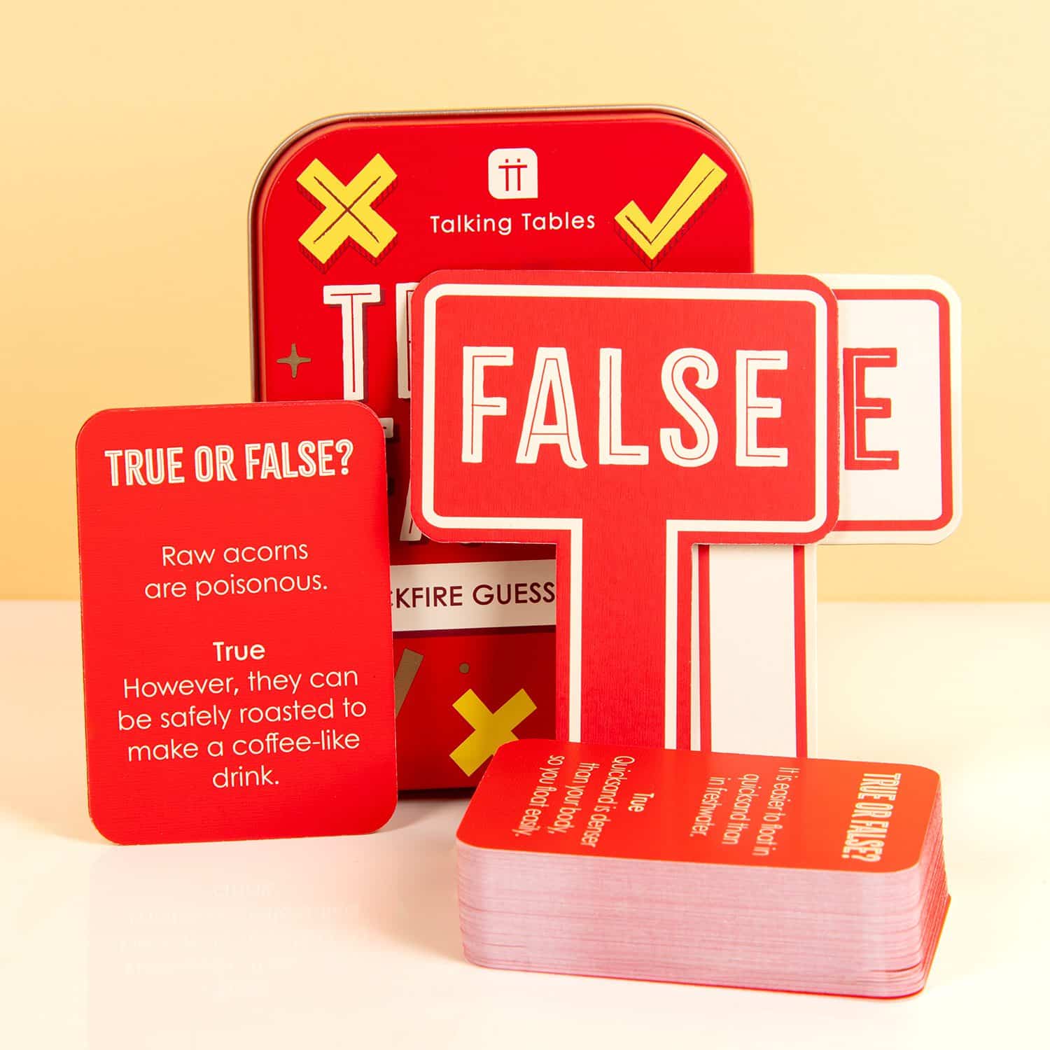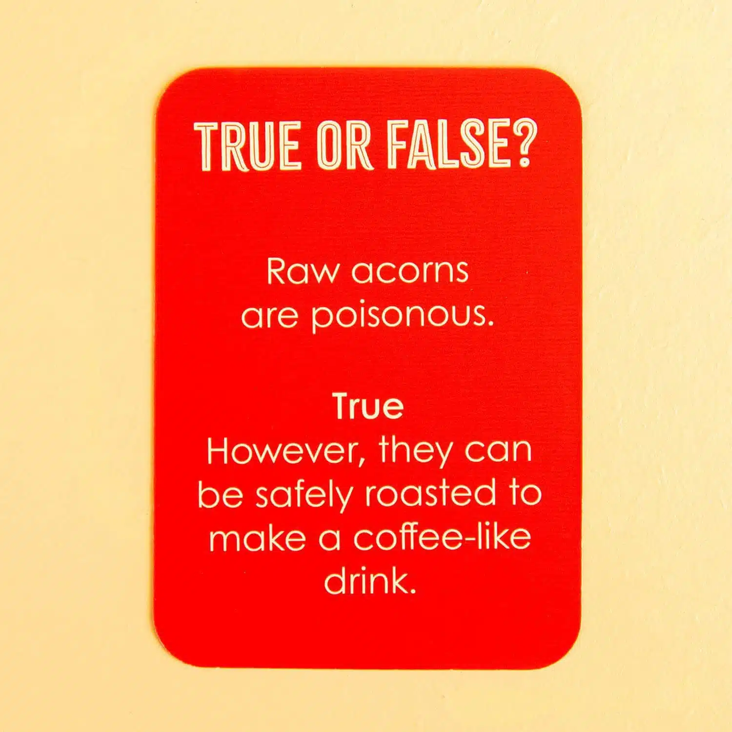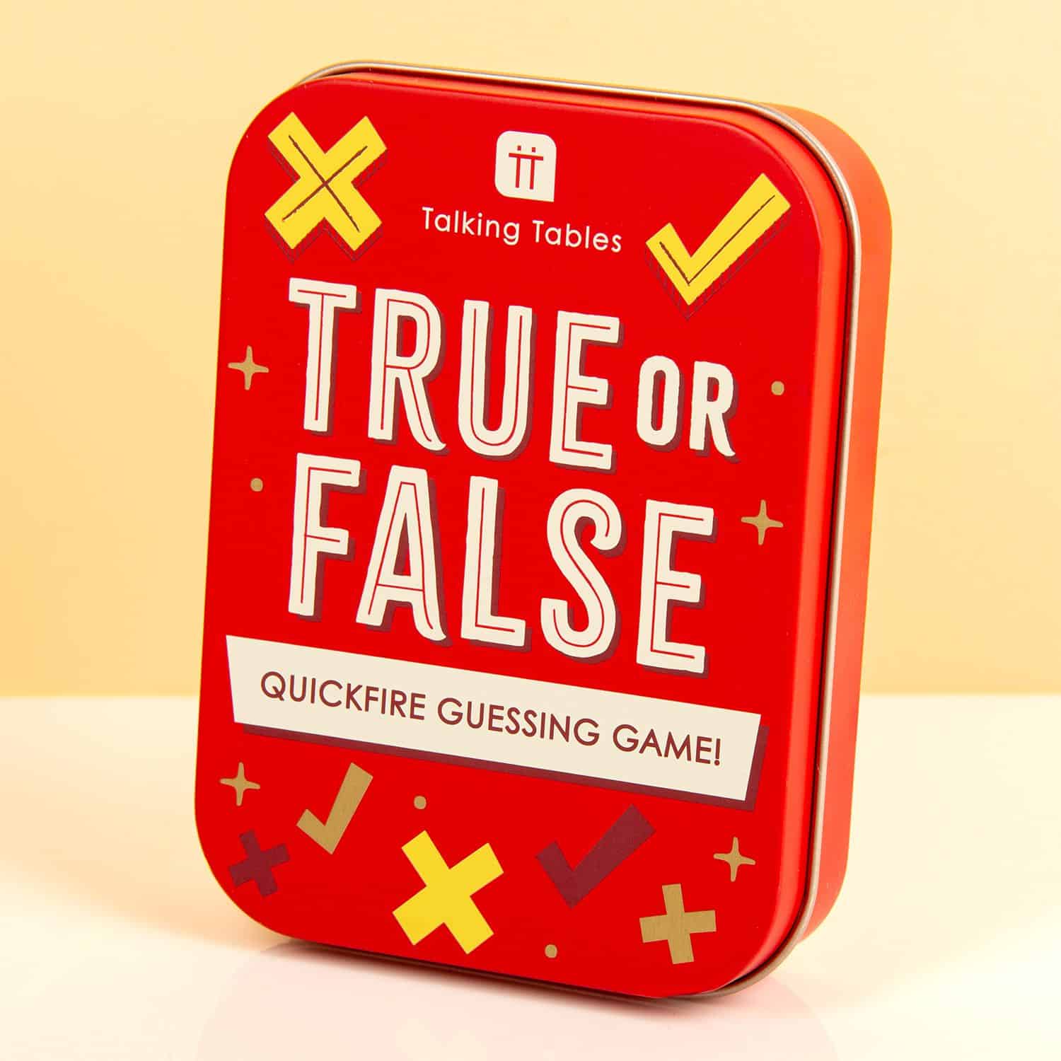 Waar komt de naam Amaretto vandaan? Kun je rauwe eikels eten? Het spel True or False in een blikje van Talking Tables is een spelletje waarbij je razendsnel moet antwoorden of het voorgelezen feit true of false is. Op de kaarten staan vragen als: Tutankhamen’s tomb was discovered in the 1920s (waar) en The Flintstones live in a town called Rubblesville (niet waar). De set zit verpakt in een handig blikje, waardoor je het makkelijk mee kunt nemen, en heeft vier bordjes waar true en false op staat.