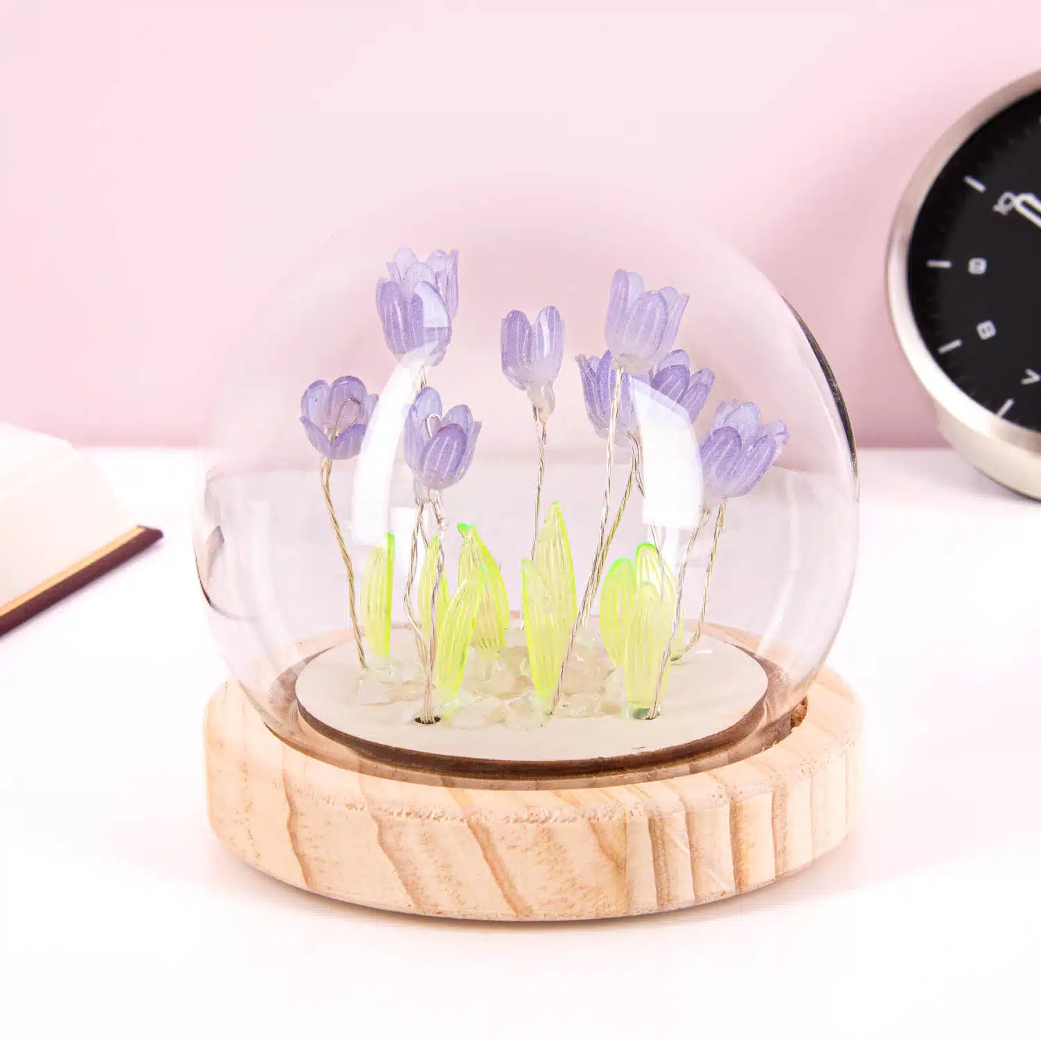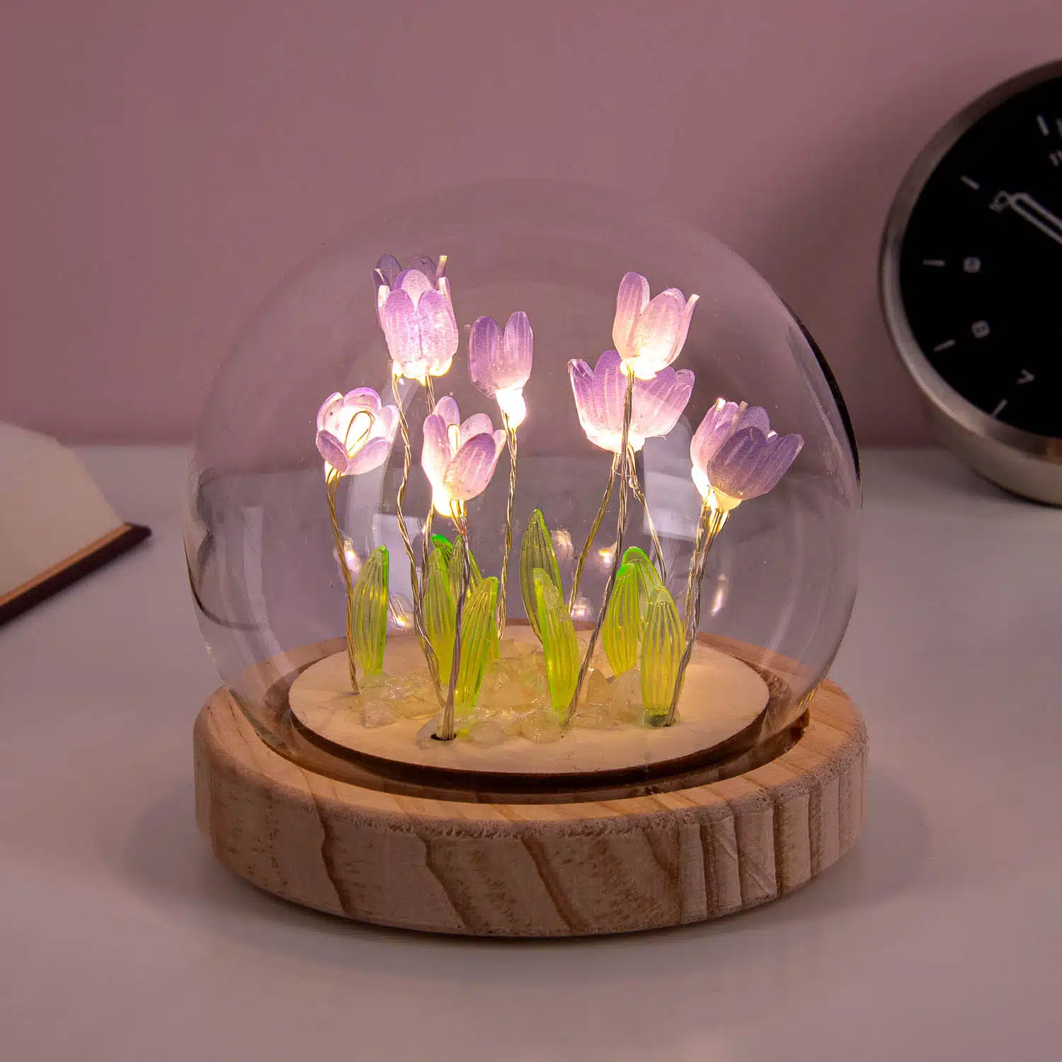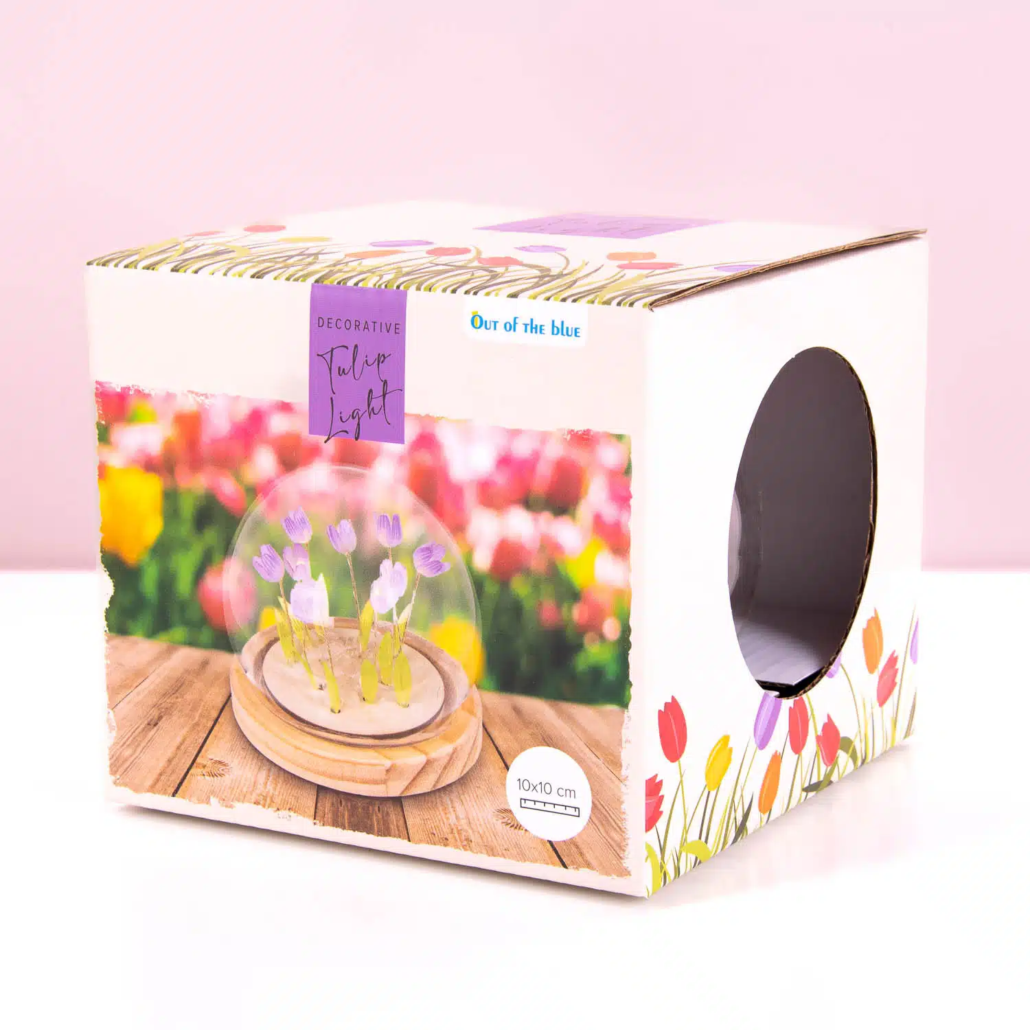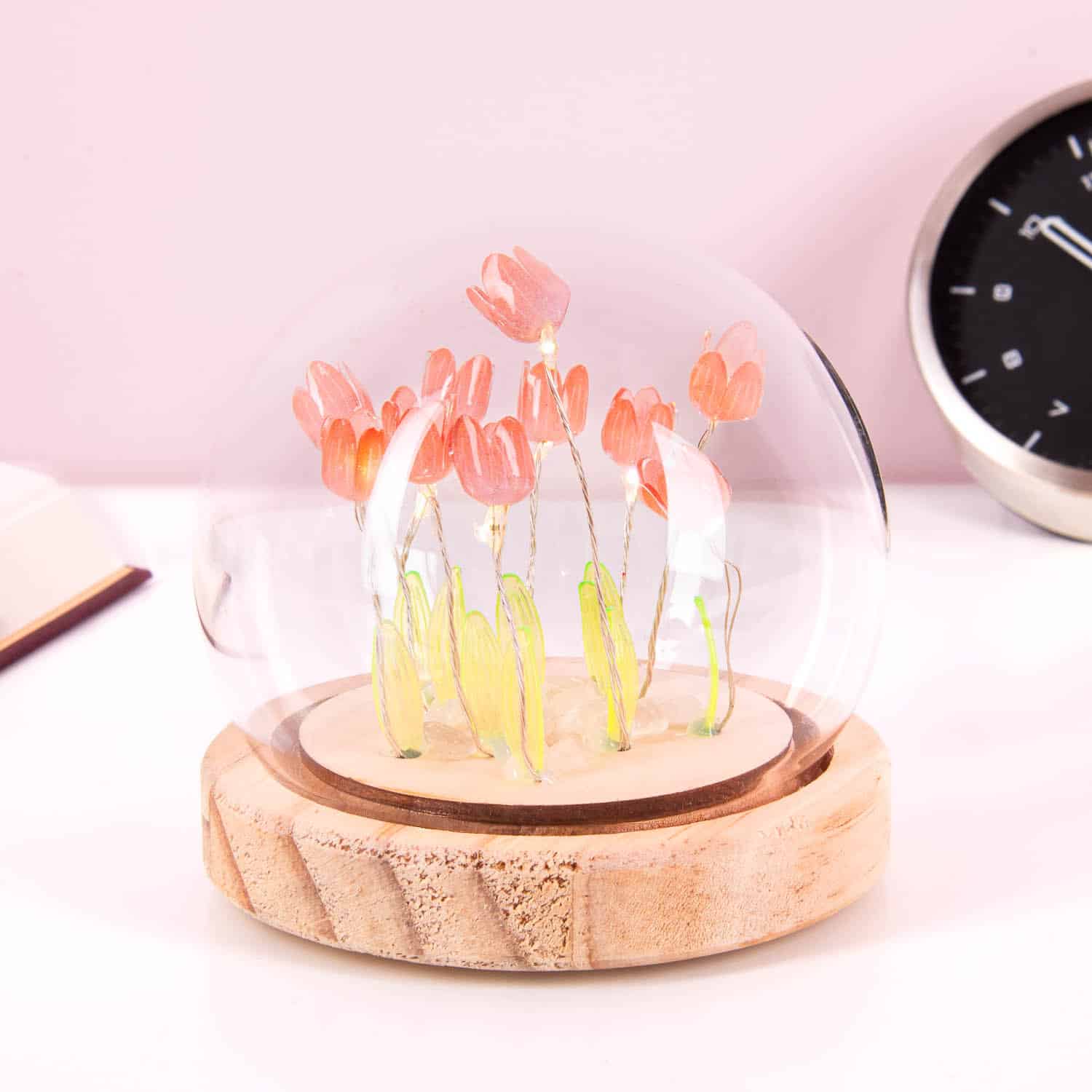Het is een vrolijk plaatje: deze Tulpenlamp. In een kleine, glazen stolp zitten tulpjes met ledverlichting. Voor als je alvast de lente in huis wilt halen.