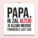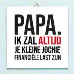 Papa: jouw held en persoonlijke pinautomaat. Dat is altijd zo geweest en zal nooit veranderen. Geef je pa daarom het Vaderdag tegeltje Financiële last cadeau. Dit grappige tegeltje vertelt de waarheid zoals hij is, met de tekst: Papa. Ik zal altijd je kleine meissie/kleine jochie zijn, waarbij kleine meissie/jochie is doorgehaald en in plaats daarvan financiële last staat. Een lollig cadeau om aan je pa te geven, met zijn verjaardag, de feestdagen of Vaderdag.