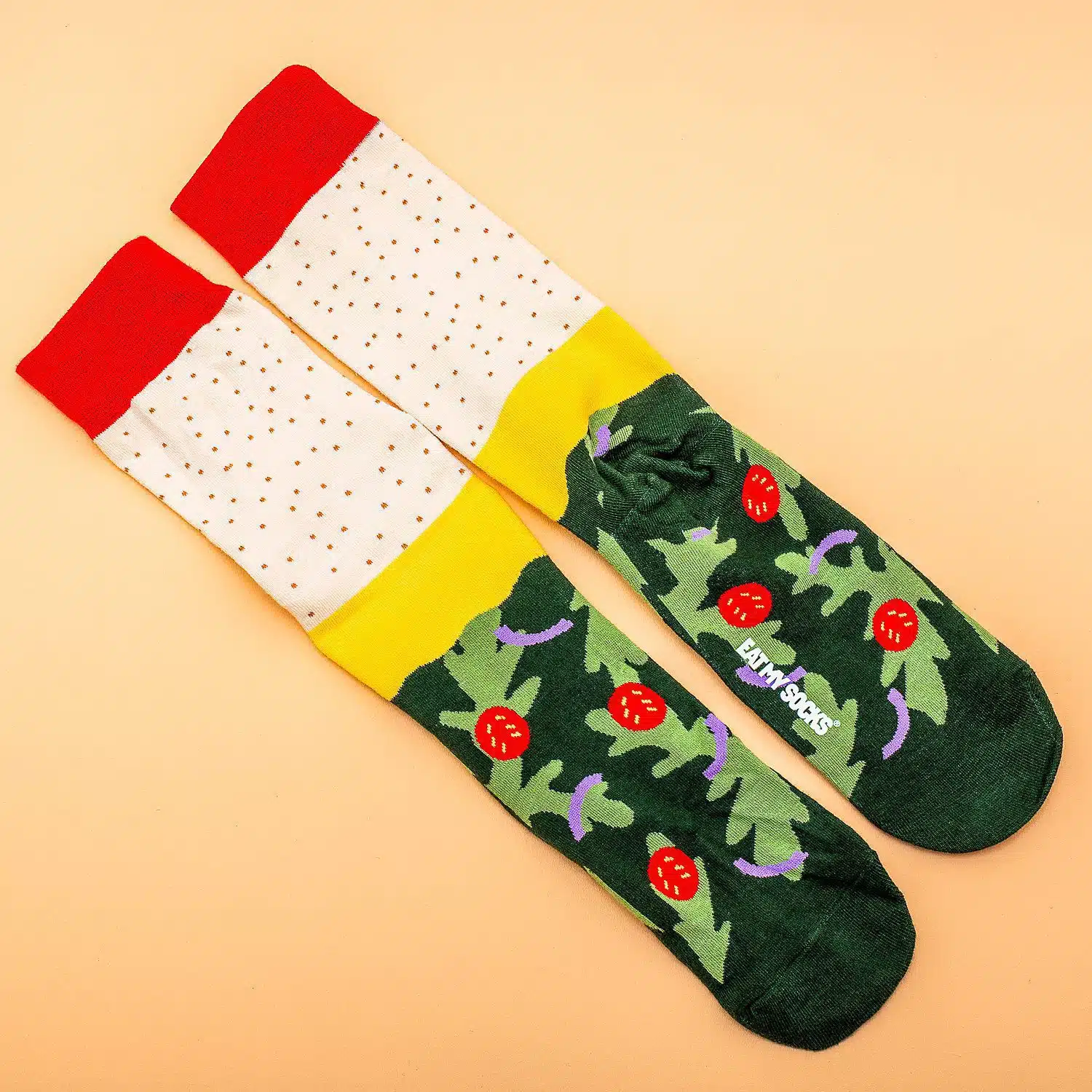 Is een vega pizza jouw standaard keuze als je pizza besteld? Dan draag je de Vega pizza sokken van Eat My Socks vast ook met trots! Deze unieke sokken zien er in de verpakking uit als een vegetarische pizza. Belegd met kaas, tomaatjes en natuurlijk sla. Een hilarisch paar sokken voor iedereen die dol is op pizza.