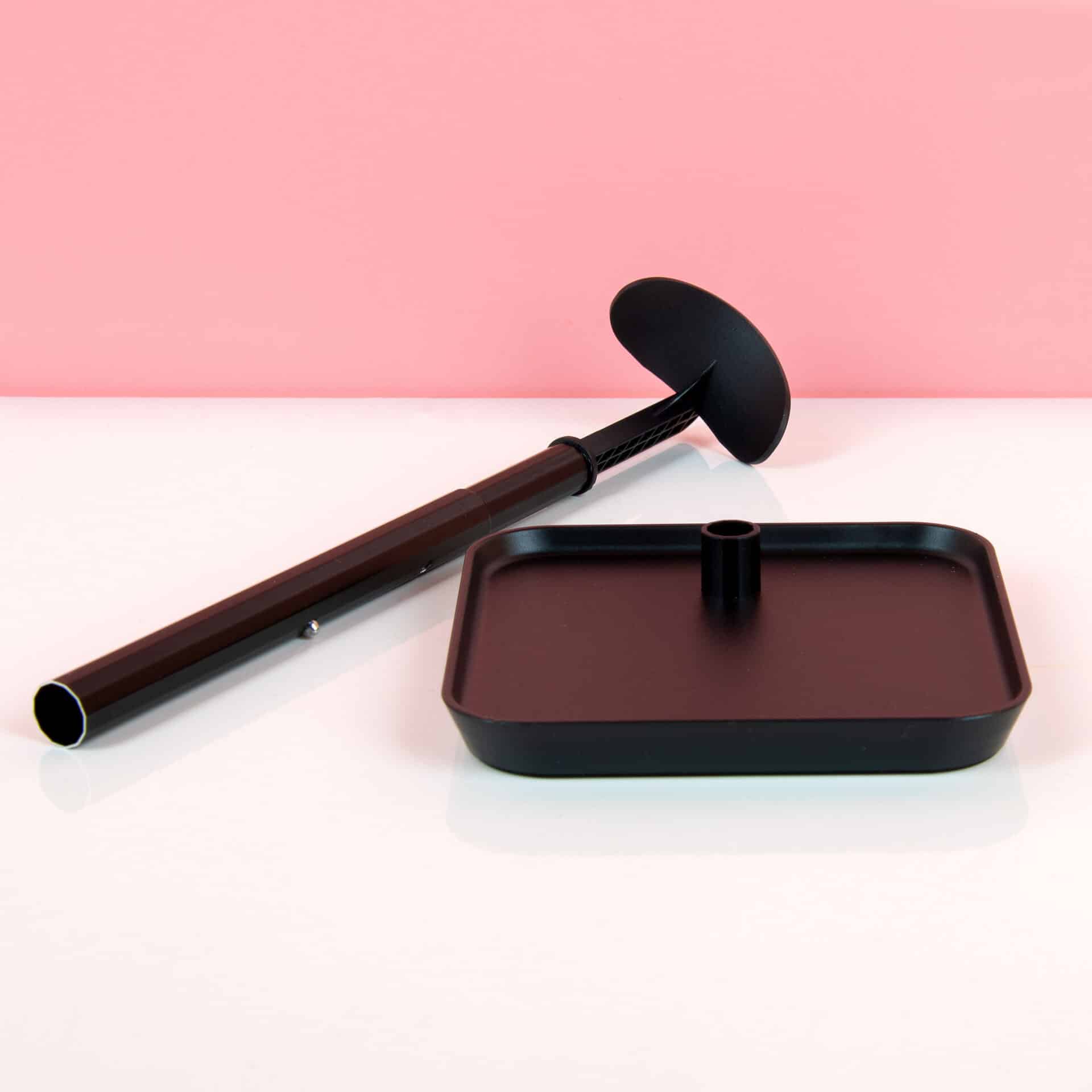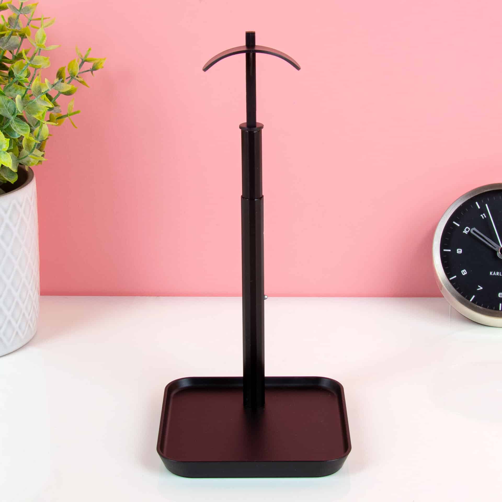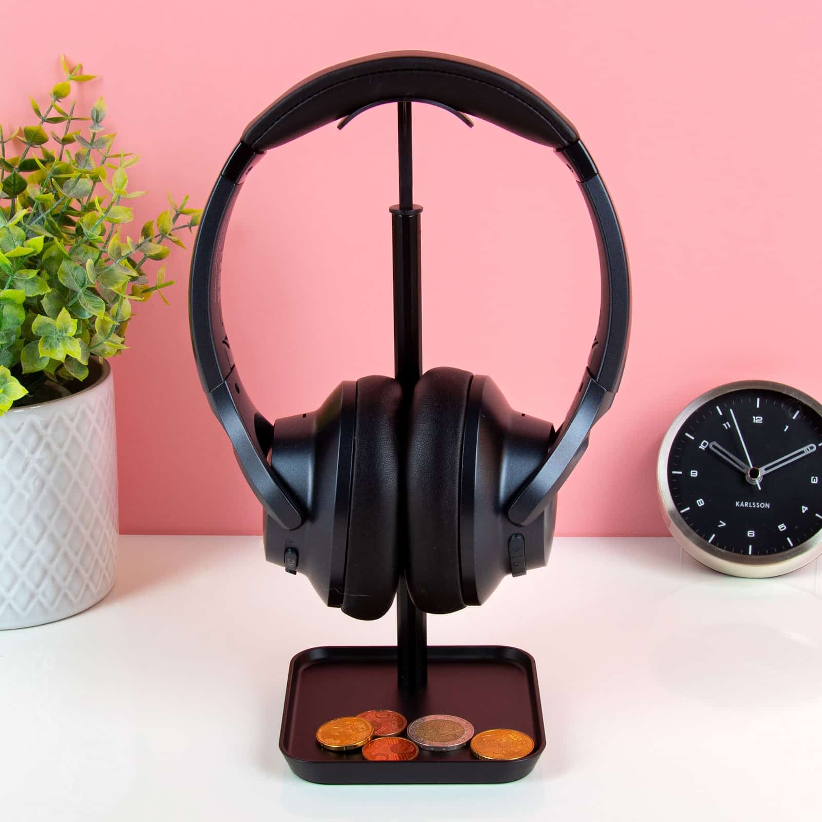 Handige standaard om je koptelefoon op te hangen, die verstelbaar is in hoogte. De standaard heeft een vierkante voet met een opstaande rand, waar je kleine dingen als een sleutelbos, oplaadkabel en muntgeld in kunt bewaren.