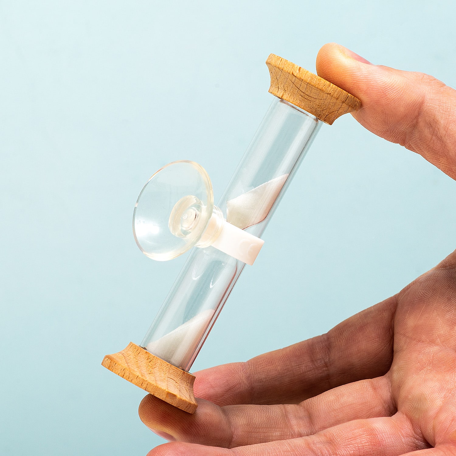 • De zandloper is transparant met houten uiteinden en heeft wit zand.