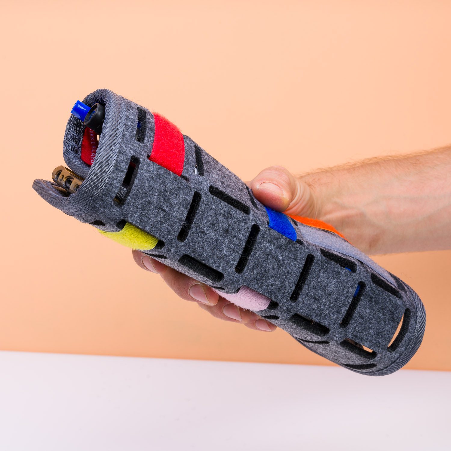 Vind jij in de krochten van je tas kabels, pennen, snoeppapiertjes en tampons, maar kun je nooit je sleutels vinden zonder hem eerst om te kieperen? Met de Vilten tas organiser van Kikkerland is dat verleden tijd. De organiser is een bord met verschillende openingen. Met de meegeleverde bandjes met klittenbandsluiting kun je bijvoorbeeld je sleutelbos, telefoon en oordopjes daarop vastmaken. Stop de organiser vervolgens in je tas en je hebt alles lekker georganiseerd.