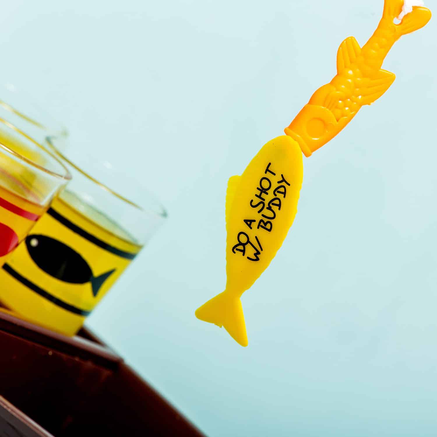 - Inhoud: boot, zes shotglaasjes, hengel en vissen