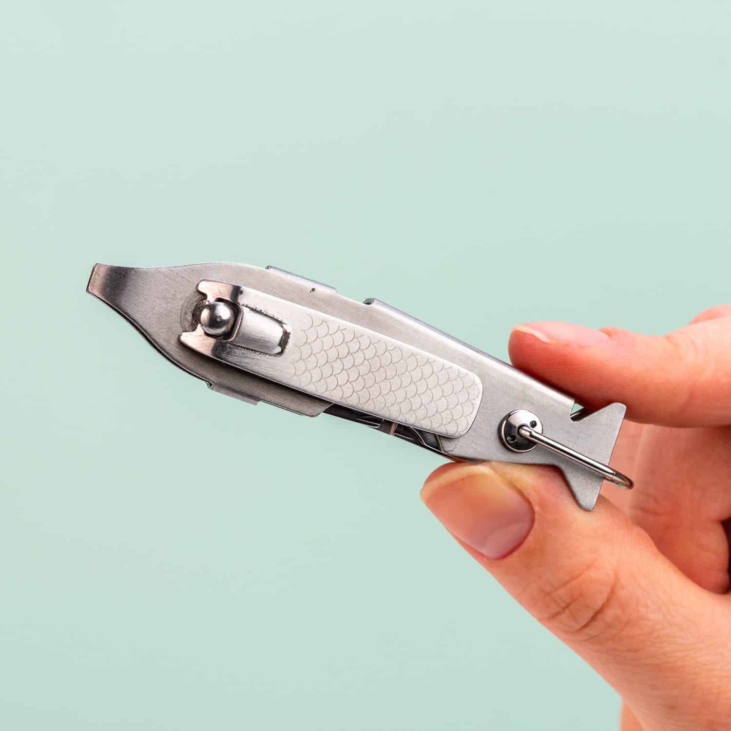 Kan een vis behulpzaam zijn? Wel als je het hebt over de Vis multitool van Kikkerland. Deze compacte multitool bevat maar liefst negen verschillende tools die je kunt gebruiken tijdens het vissen of in het dagelijks leven. Je kunt er bijvoorbeeld je nagels mee knippen, een sleutelring mee openen en schroefjes mee aandraaien. Daarnaast bevat de multitool een schaar, mesje, knot tag crimper en een tool om je haken schoon te maken. En dat allemaal aan een praktische ring, waarmee je hem aan je sleutelbos vast kan maken.