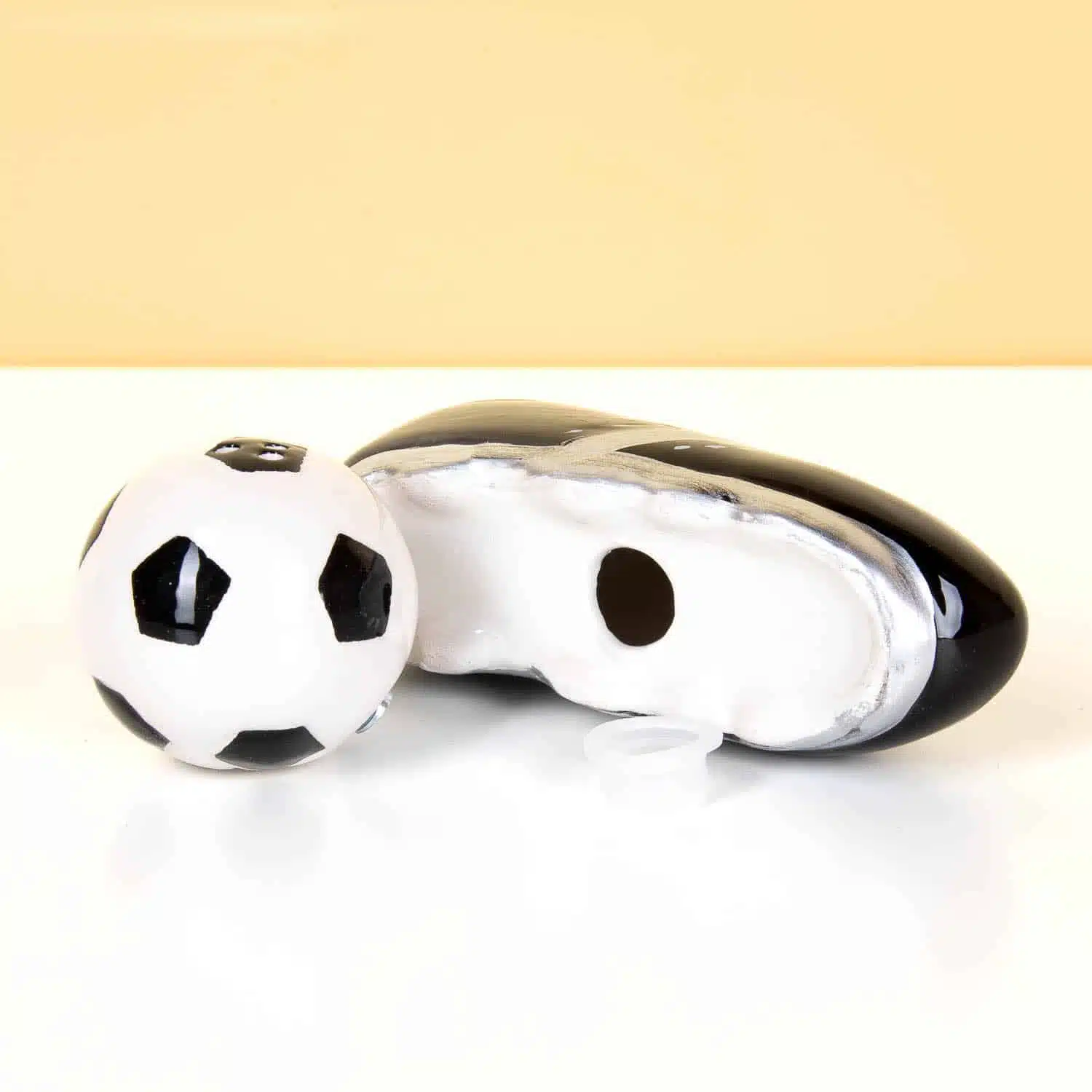 Voetbalfan aan tafel? Het Voetbalschoen en bal peper- en zoutstel scoort bij elk diner! Dit keramische peper- en zoutstel bestaat uit een voetbalschoen en een bal die magnetisch aan elkaar vastzitten. Perfect voor voetbalfans, sportliefhebbers of gewoon om je eettafel wat sportieve flair te geven. Komt in een giftbox, dus hij is meteen klaar om cadeau te geven!