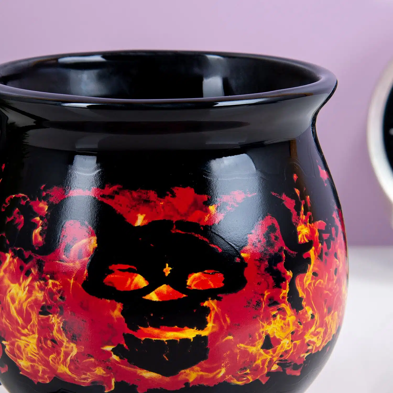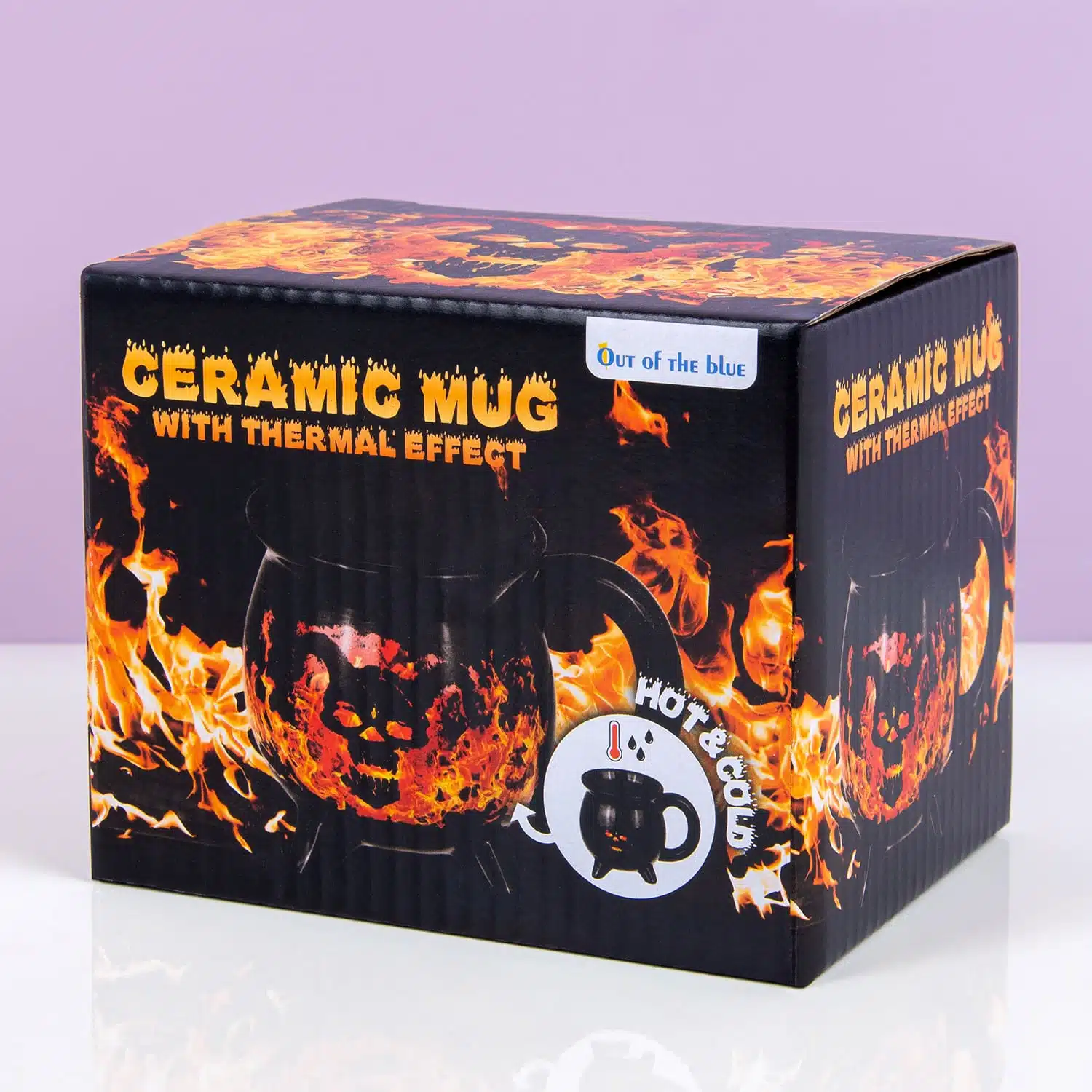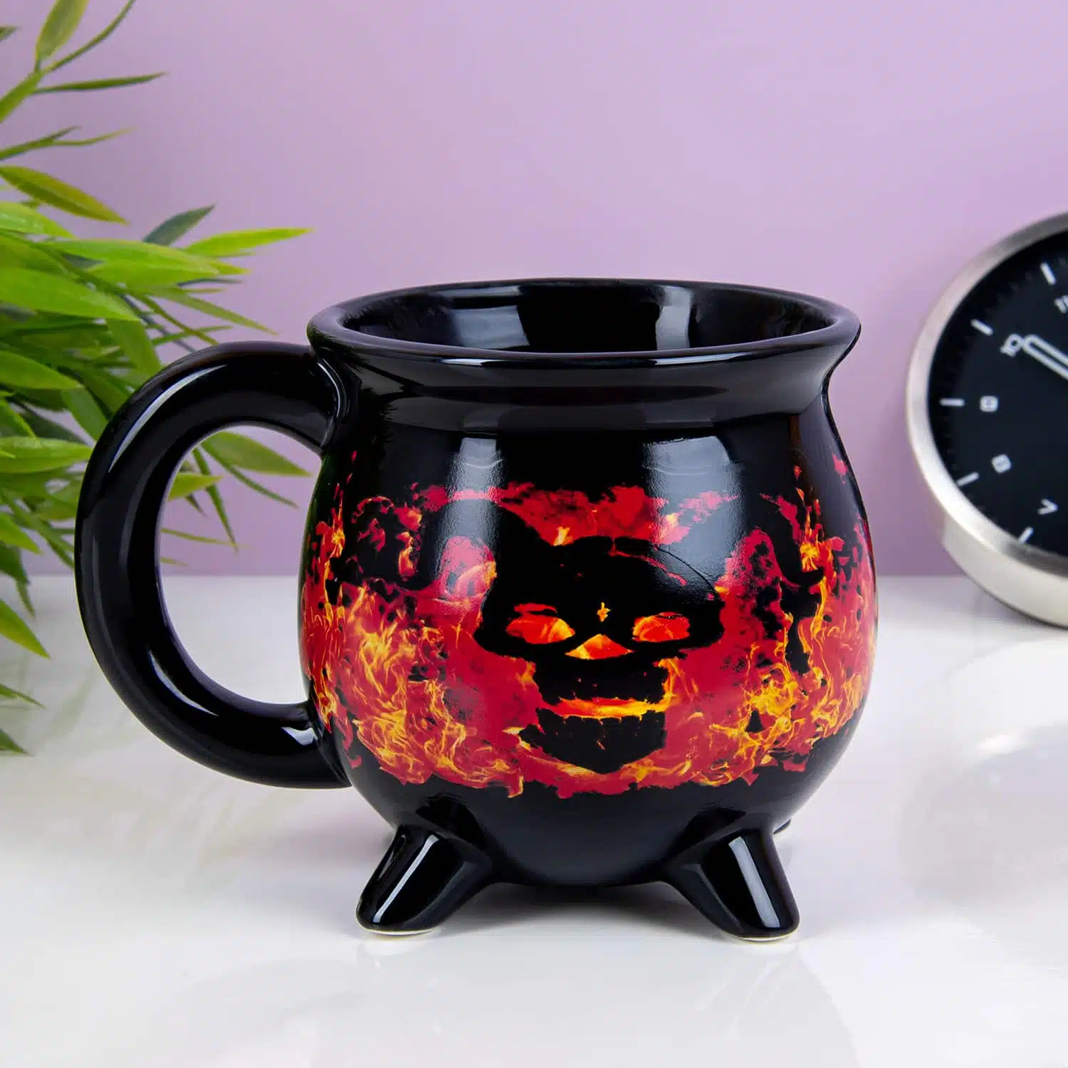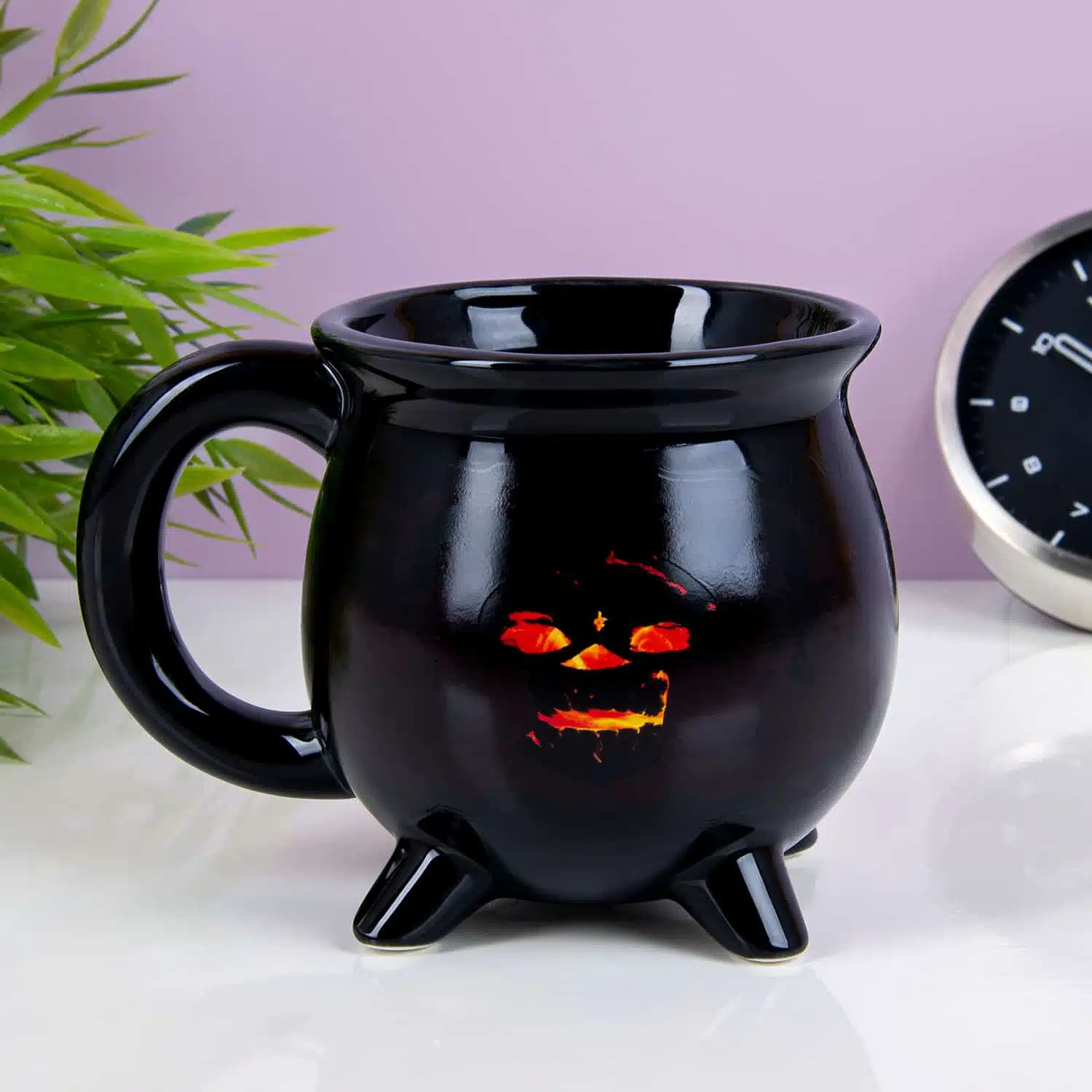 - De mok lijkt op een heksenketel en is zwart, met lichtgevende mond en ogen