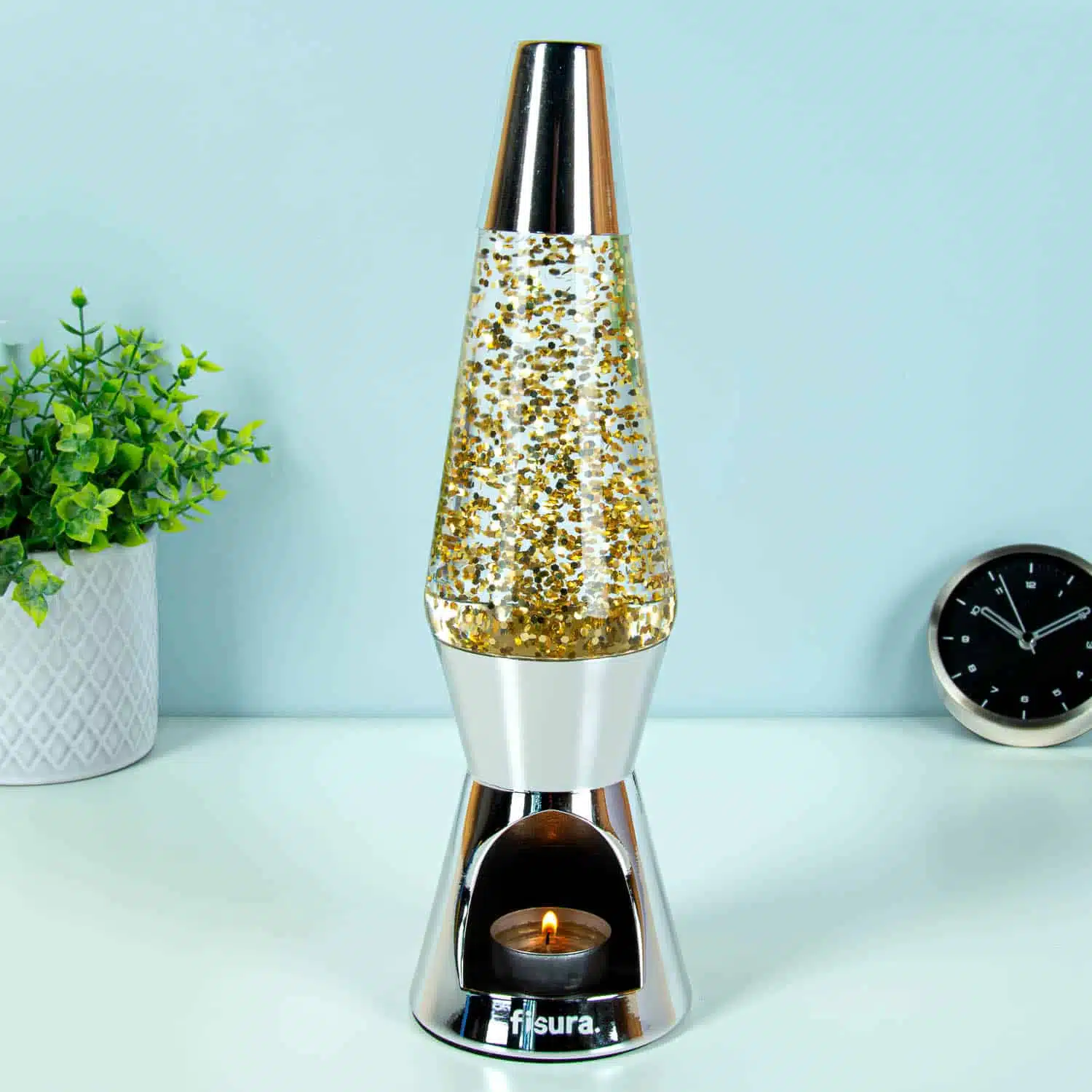 De Waxinelicht lavalamp gouden glitters van Fisura werkt op waxinelichtjes in plaats van elektriciteit: eindelijk een lavalamp zonder gedoe met kabels. Met gouden glitters die bewegen door de warmte van de kaars creëer je instant sfeer. Super gezellig in je woonkamer, maar bijvoorbeeld ook om buiten in de tuin te zetten tijdens een zwoele zomernacht.