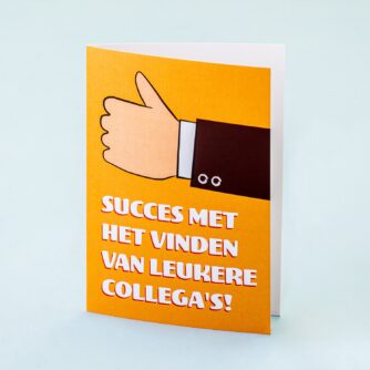 Gefeliciteerd collega, met je nieuwe baan. En veel succes met het vinden van leukere collega’s! Dat laatste is de motiverende tekst op de Wenskaart Collega nieuwe baan. Stuur deze kaart naar je leukste collega, die jullie helaas gaat verlaten. De kaart kun je, met een persoonlijke boodschap die wij voor je opschrijven, samen met een cadeautje versturen naar de ontvanger, of je schrijft hem gewoon zelf.