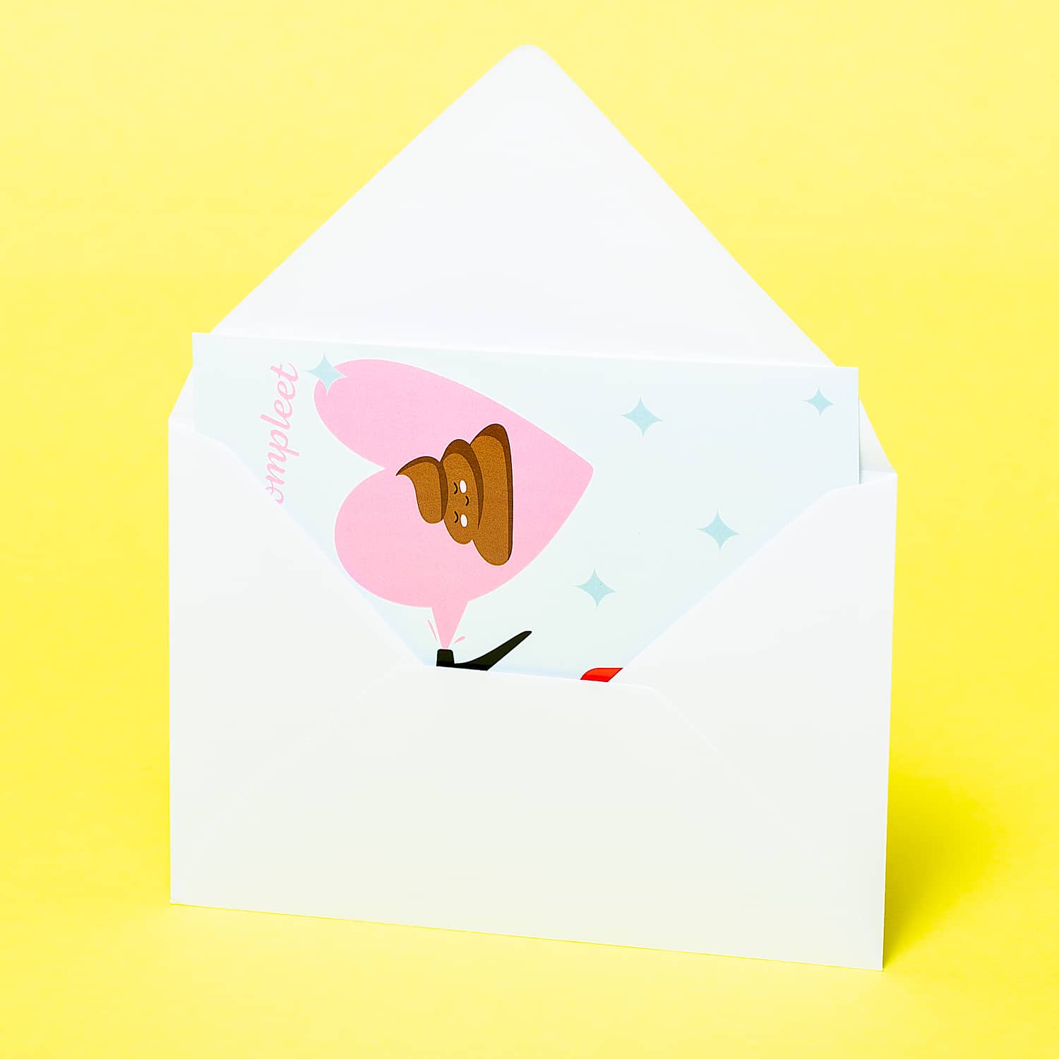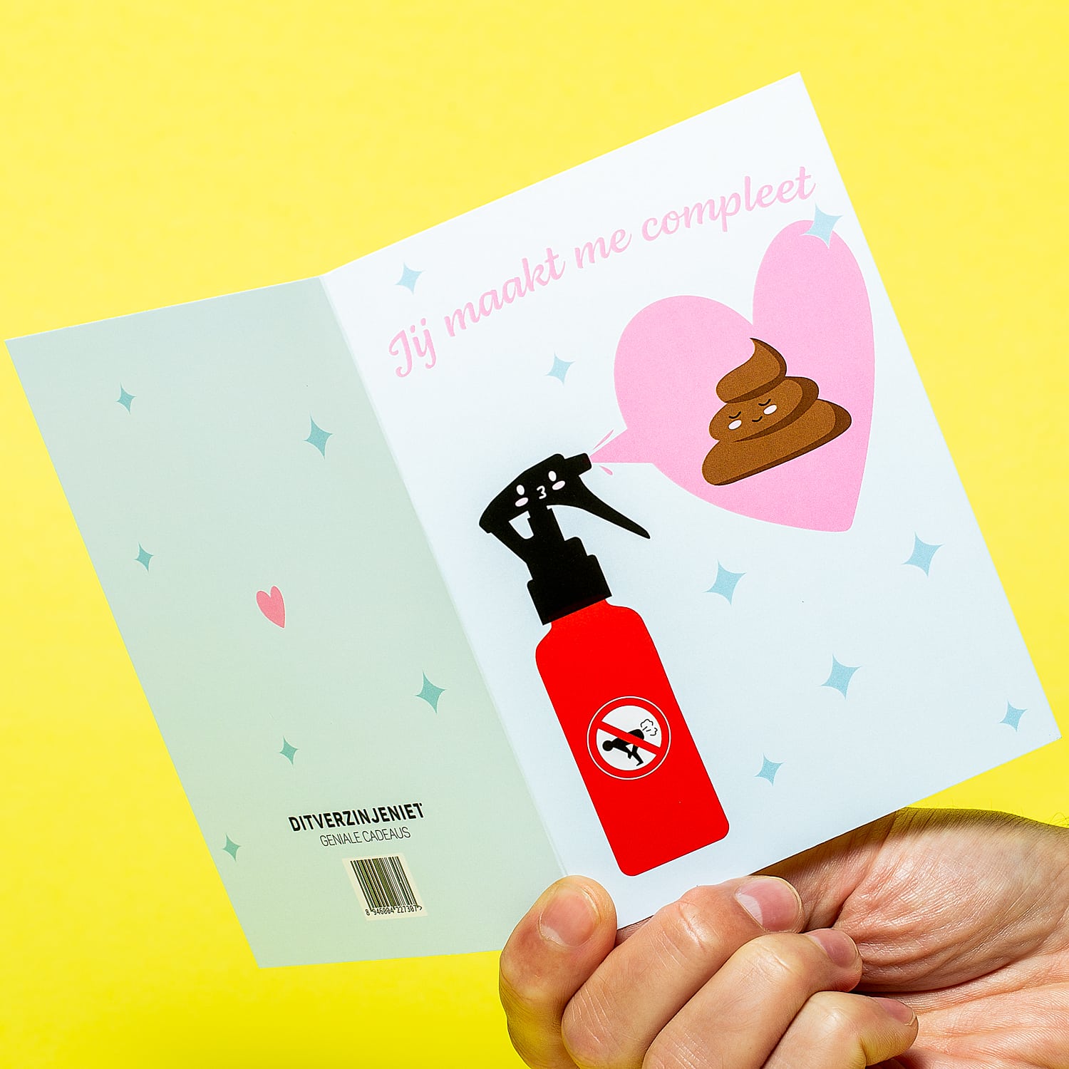 Rozengeur en maneschijn, aardbeien en slagroom: romantische dingen die écht bij elkaar horen. Verras je geliefde voor Valentijnsdag of zomaar met de romantische Wenskaart Jij maakt me compleet. Op de voorkant staat een straalverliefde… luchtverfrisser. En die is hartstikke dol op zijn drolletje: dat zie je wel aan het hartje dat ‘ie sprayt. Bovenaan staat de tekst: Jij maakt me compleet.