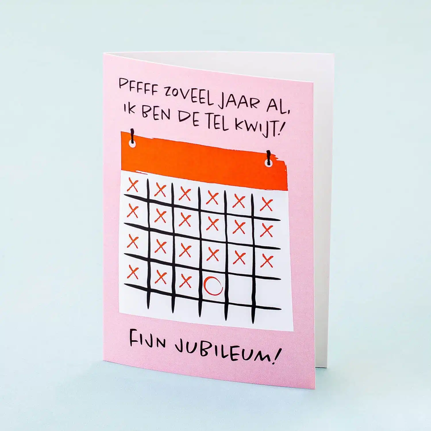 Wacht, hoeveel jaar zijn jullie al getrouwd? En werk jij serieus al 25 jaar voor dezelfde baas? Een jubileum is iets om te vieren en na zoveel jaar trouwe dienst kan er heus wel een kaartje vanaf. Feliciteer je zusje met haar jaar verkering, je wederhelft dat hij het al vijf jaar met je uit houdt of je tante met haar werkjubileum, met de Wenskaart Jubileum kalender. De kaart is voorzien van een kalender met kruisjes en de tekst: Pffff zoveel jaar al, ik ben de tel kwijt. Fijn jubileum! Je kunt de kaart samen met een cadeautje rechtstreeks naar de ontvanger laten versturen: wij schrijven dan je persoonlijke boodschap op de kaart.
