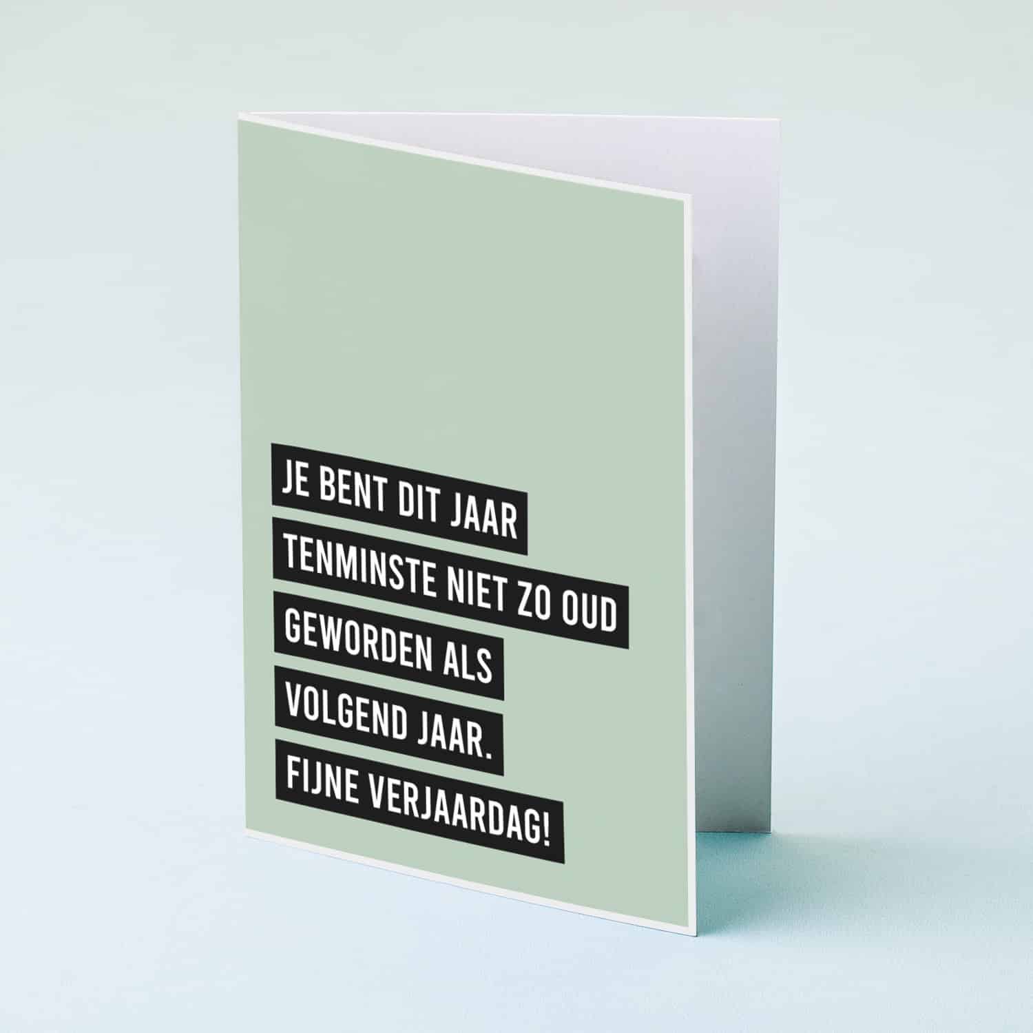 Niet iedereen vindt het leuk om geconfronteerd te worden met zijn of haar verjaardag. Maar gelukkig ben jij er, als goede vriendin, om de pijn wat te verzachten. De hilarische Wenskaart Niet zo oud als volgend jaar is de perfecte verjaardagskaart. Op de kaart staat de tekst: Je bent dit jaar tenminste niet zo oud geworden als volgend jaar. Fijne verjaardag!