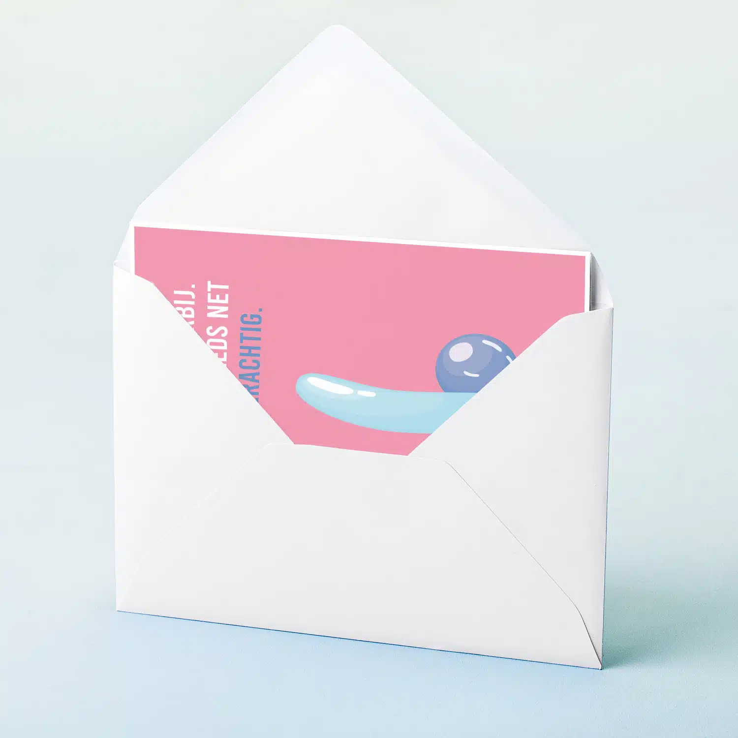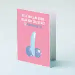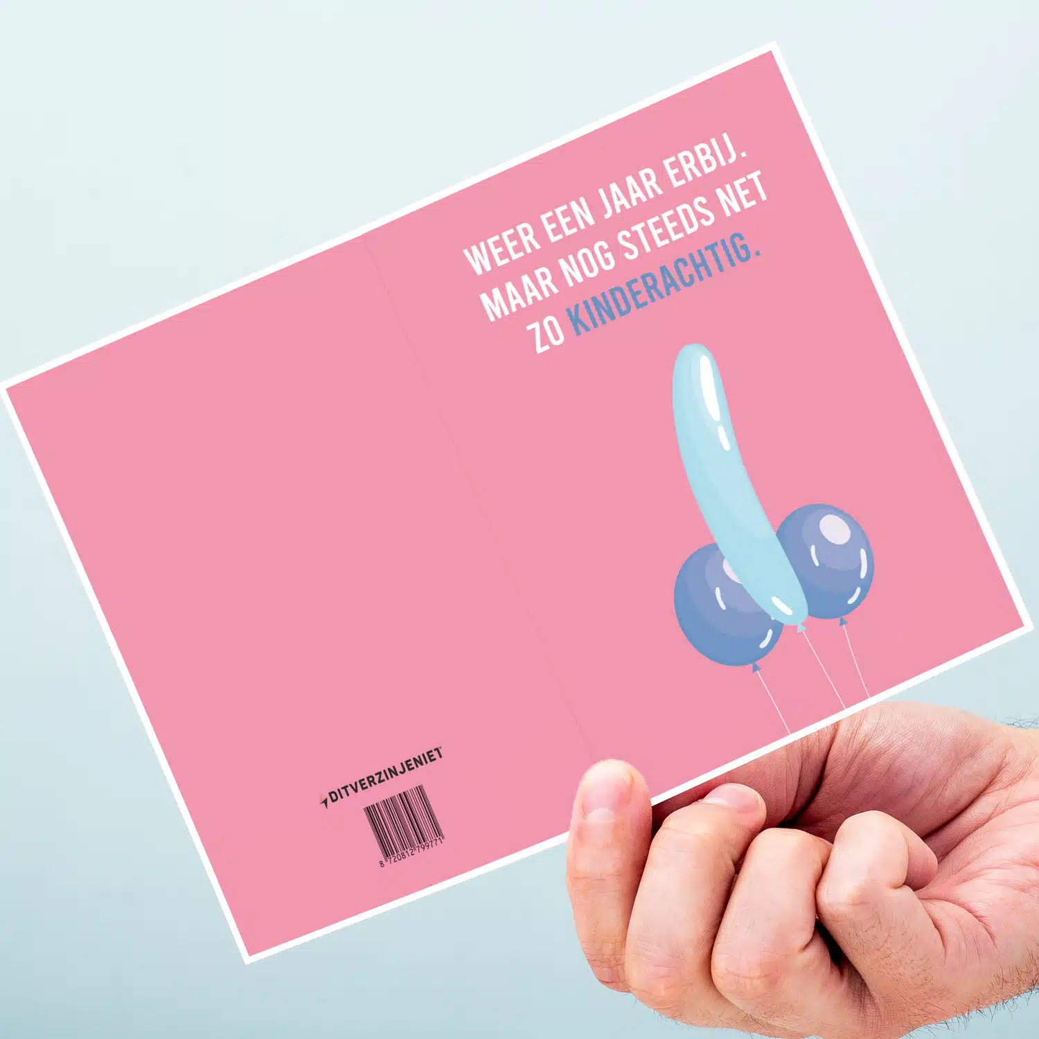Gefeliciteerd, pik, met je verjaardag. Je mag dan wel een jaar ouder zijn, je bent nog steeds net zo kinderachtig. Dat is zo ongeveer de gedachten achter de Wenskaart Nog net zo kinderachtig. Een hilarische en brutale verjaardagskaart, met een illustratie van drie ballonnen, die samen een penis en twee ballen vormen. Daarboven staat de tekst: Weer een jaar erbij. Maar nog steeds net zo kinderachtig.