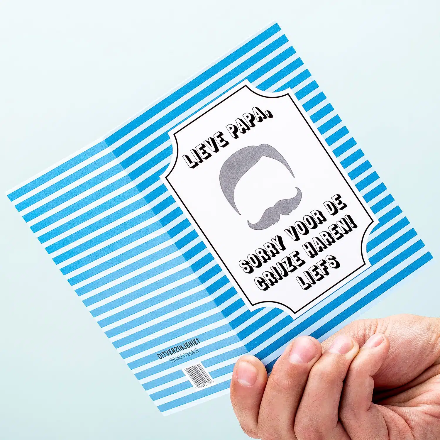 Vaders: ze staan altijd voor je klaar. Ook als je keer op keer domme dingen doet. Daar zijn vaders per slot van rekening voor. Met de Wenskaart Sorry voor de grijze haren kun jij je pa bedanken voor zijn goede zorgen. Deze leuke kaart stuur je bijvoorbeeld naar je vader op zijn verjaardag of je geeft hem met Vaderdag.
