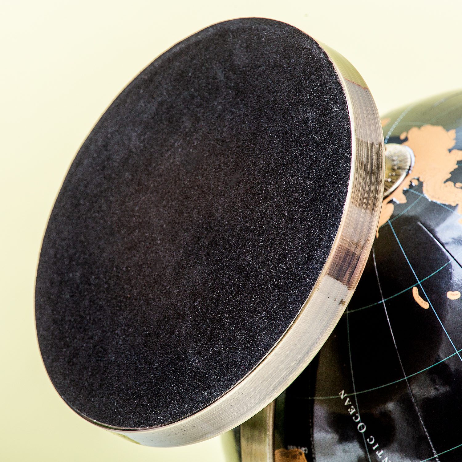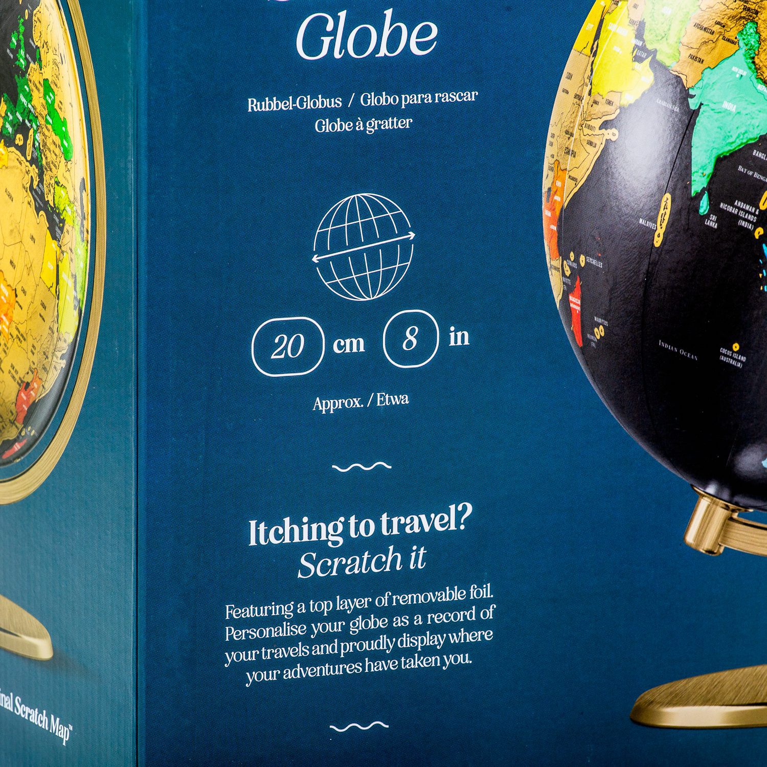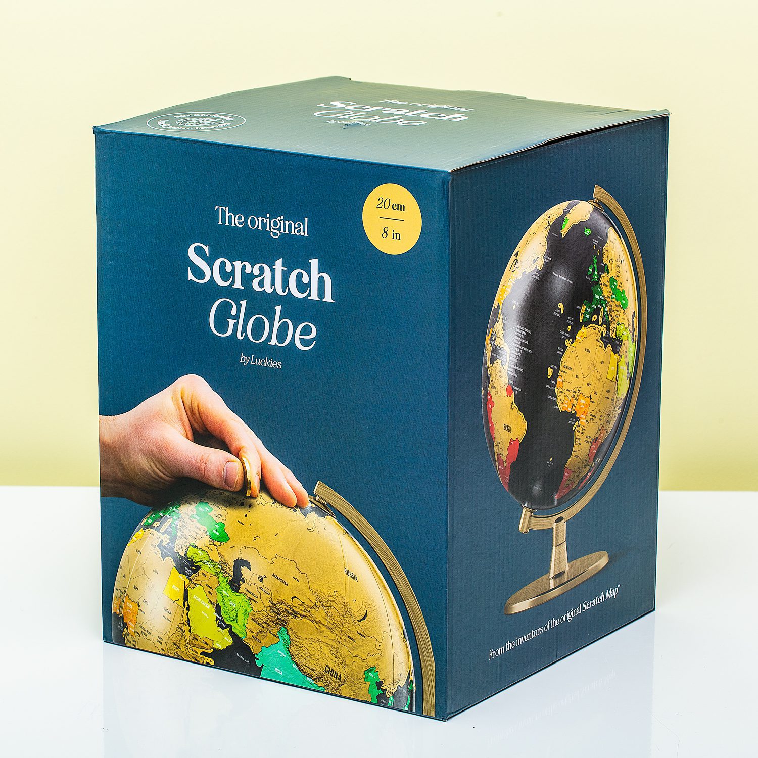 Een mooi woonaccessoire en een leuke manier om te laten zien waar je allemaal al bent geweest; dat is de Globe met krasfolie van Luckies. Deze unieke wereldbol in zwart en goud ziet er heel normaal uit, maar heeft iets bijzonders: een dun laagje goudfolie dat de landen bedekt. Het goudfolie van de landen die je al hebt bezocht kun je wegkrassen met een munt. Op die manier komen er vrolijk gekleurde landen tevoorschijn. De globe heeft een metalen basis met een oud-messing kleur.