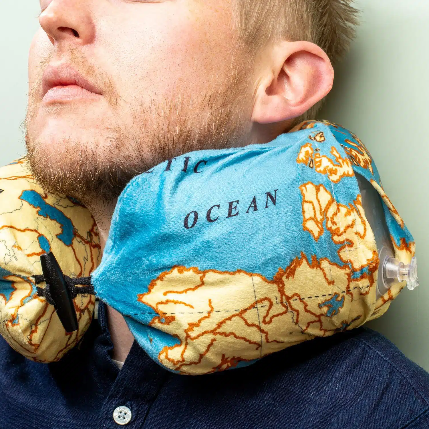 Comfortabel reizen: dat willen we allemaal. Maar niet iedereen heeft de financiën voor een privéjet of een eersteklas ticket. Daarom behelpt de rest zich maar met een nekkussen. Het Wereldkaart opblaasbaar nekkussen van Kikkerland zorgt ervoor dat je even lekker je ogen kunt sluiten tijdens een lange vlieg- of treinreis. Met het nekkussen kan je je hoofd makkelijker laten rusten. Het fijne van dit kussen met wereldkaartprint is dat het opblaasbaar is. Gebruik je hem niet, dan laat je gewoon de lucht eruit lopen en is het een klein en compact pakketje.