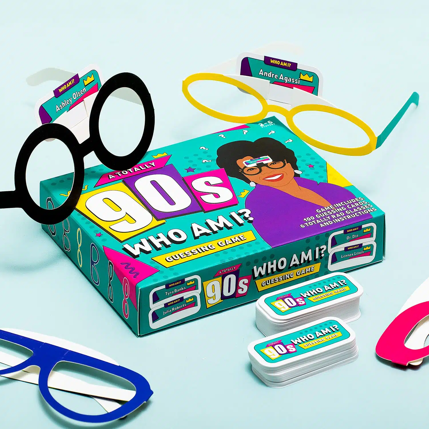 Boris Becker, Hulk Hogan, Jerry Springer en Britney Spears: allemaal iconen uit de jaren 80 en 90. Met het Who Am I spel van Gift Republic is het de bedoeling dat je raad wie er op jouw naamkaartje staat. Trek één van de honderd naamkaarten uit de stapel en plaats het in de speciale bril. Zo kunnen anderen zien wie jij moet raden. Een grappig spel voor mensen die de jaren 80 en 90 bewust hebben meegemaakt. Dit spel is leverbaar in twee varianten: 80s of 90s.