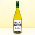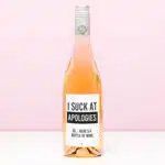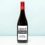 - Met de tekst: I suck at apologies. So… here’s a bottle of wine