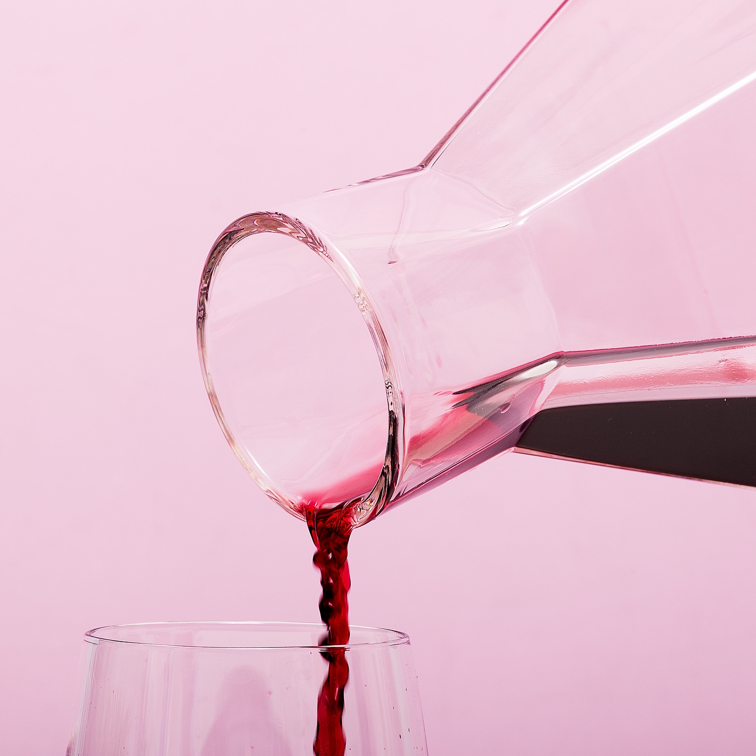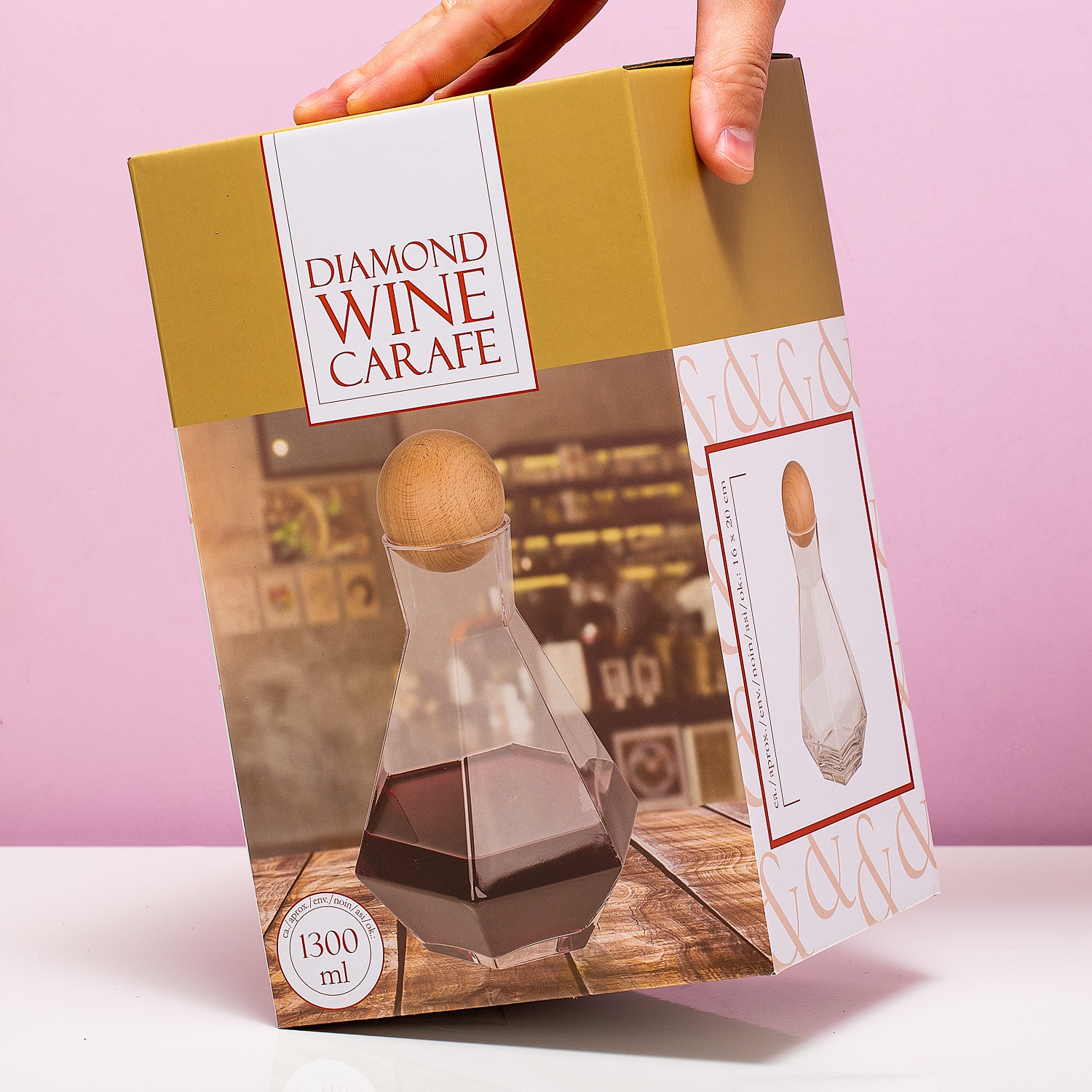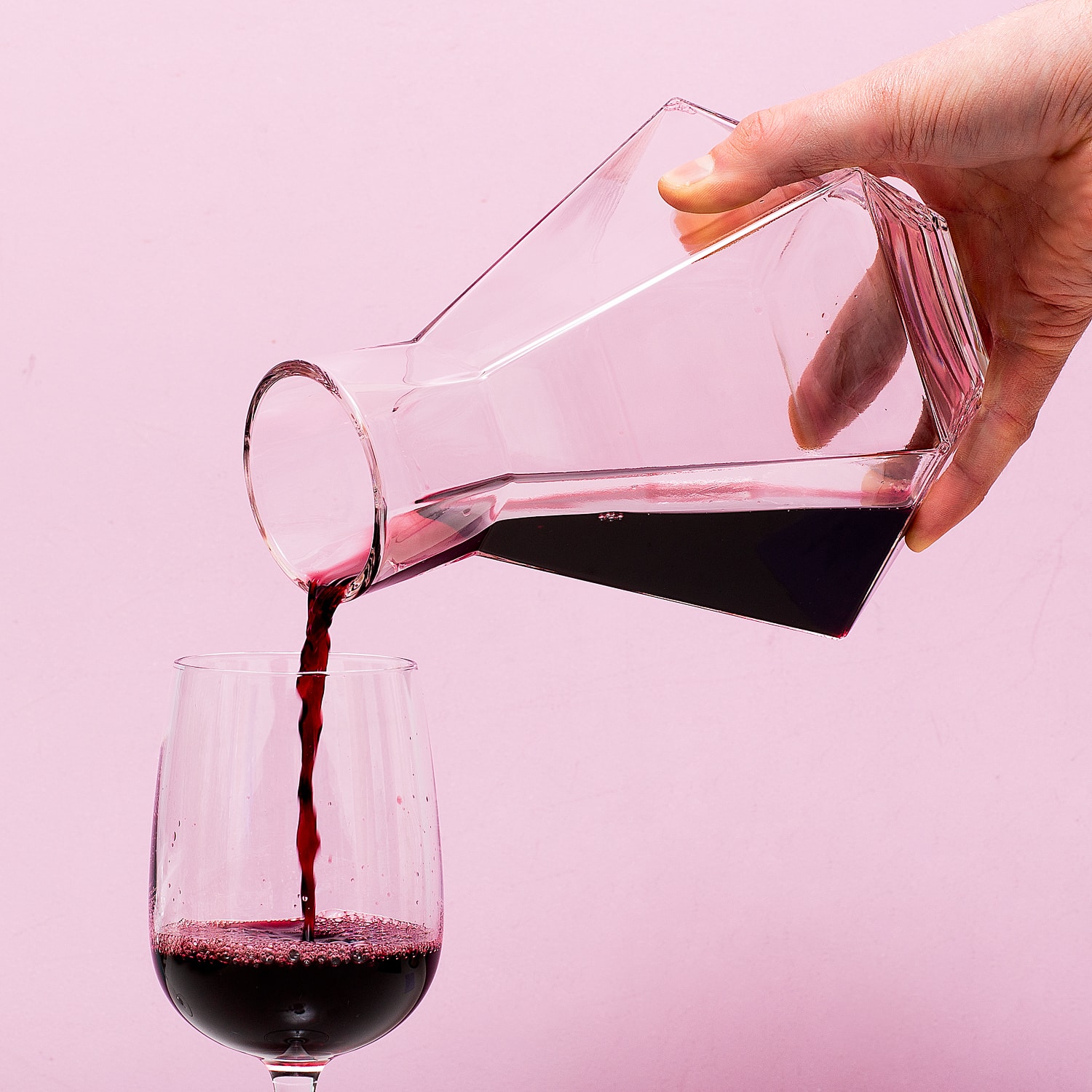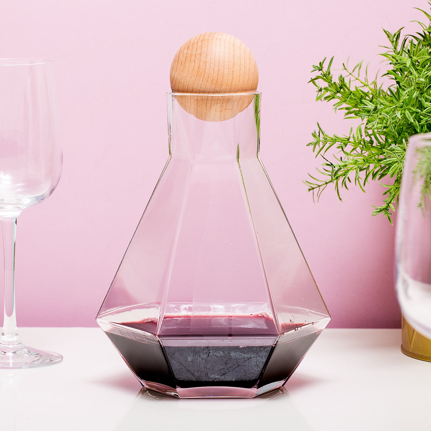 Een glazen wijnkaraf in diamantvorm, waarin je de wijn kunt laten luchten voor je hem drinkt. Zo kan het aroma en de geur van de wijn zich beter ontwikkelen.