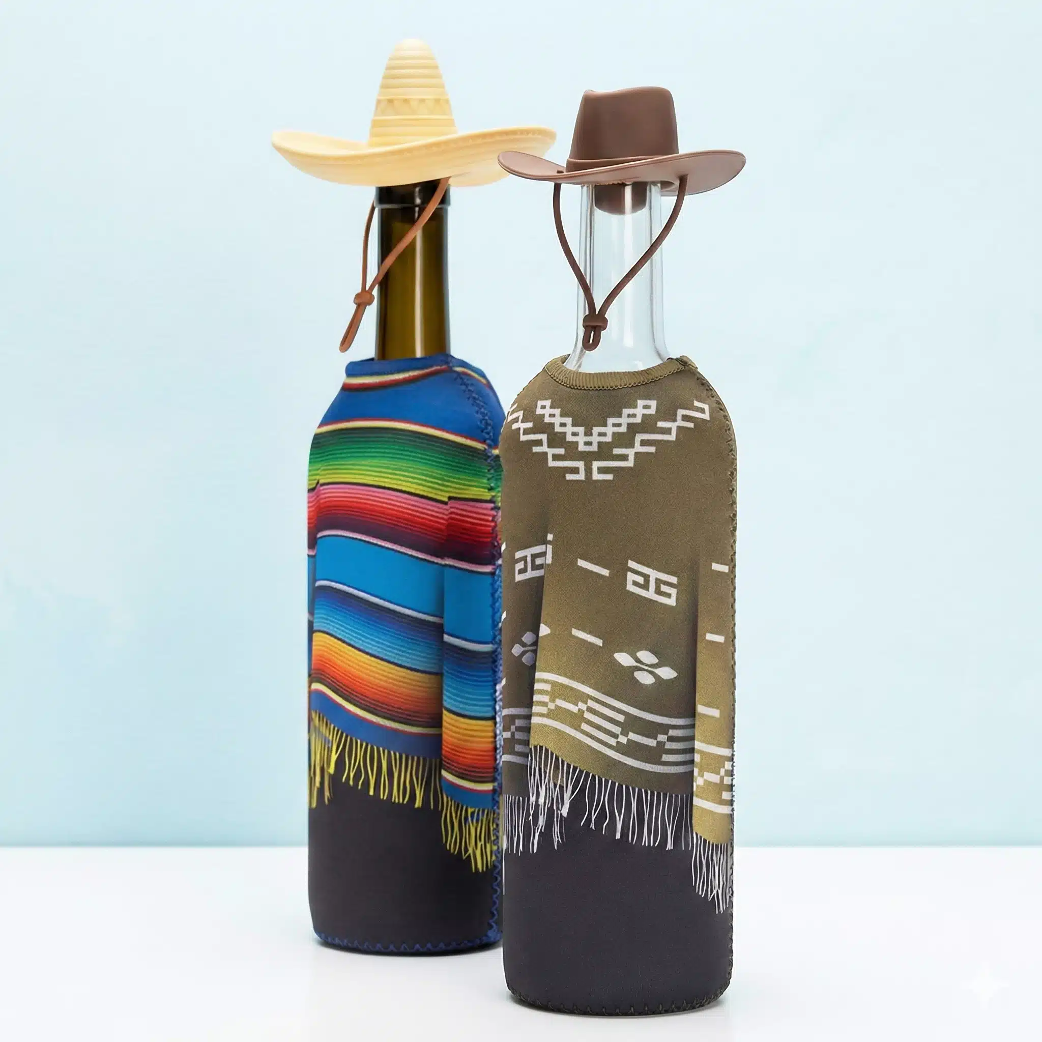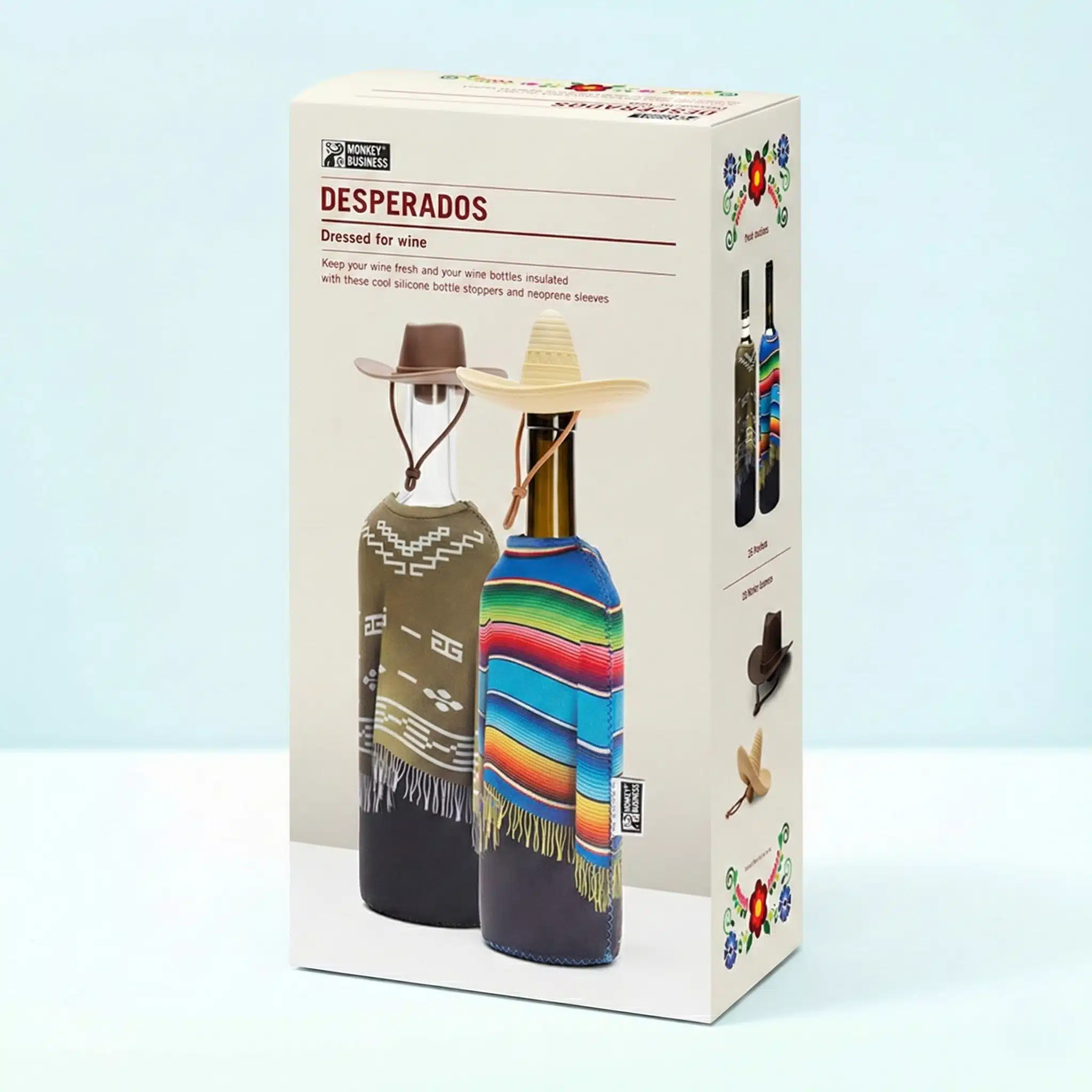 Klaar voor een feestje met Wild West vibes? De Wild West wijnset (set van 4) van Monkey Business heeft alles wat je nodig hebt! Deze all-in-one giftbox bevat poncho wijnkoeler sleeves en 2 wijnstoppers in de vorm van een sombrero en cowboyhoed. De sleeves laten het eruit zien alsof je wijnfles een poncho draagt en houden je wijnfles op temperatuur, terwijl de siliconen stoppers je geopende fles vers houden. Een leuk cadeau voor wijnliefhebbers!