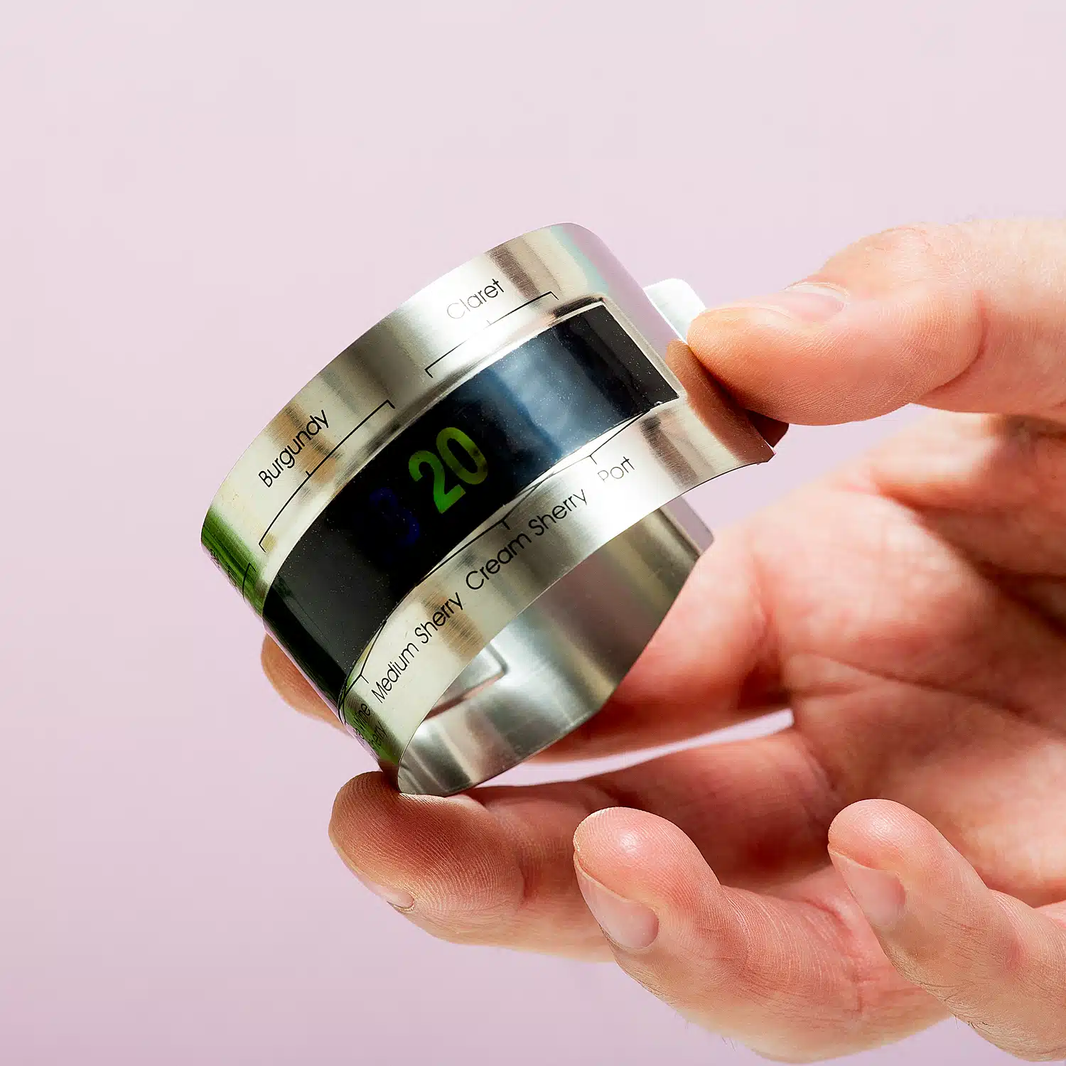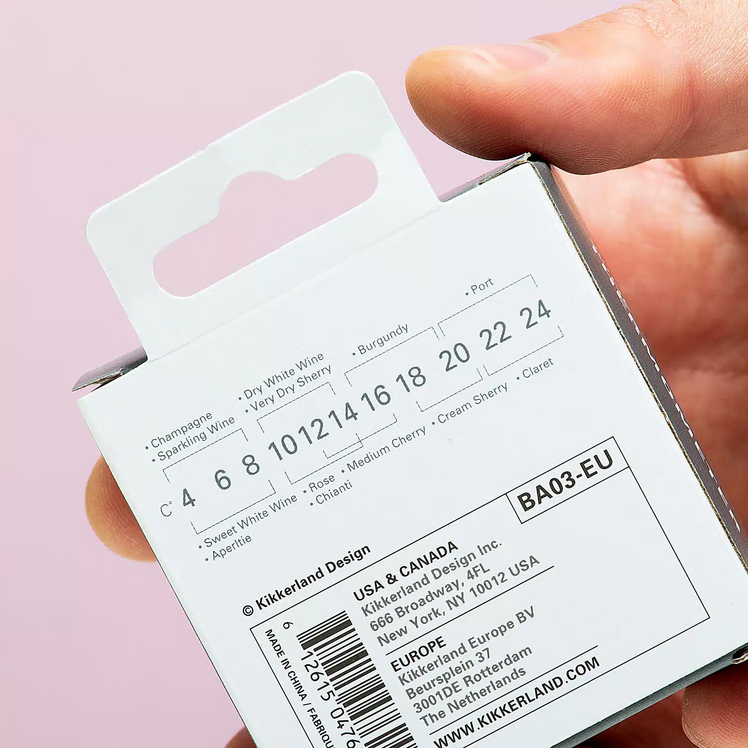 Een thermometer voor het meten van de temperatuur van je fles wijn. De flexibele band wordt om de fles geschoven en even later weet je de temperatuur van de wijn. Daarnaast staat ook op de thermometer vermeld wat de ideale temperatuur is voor de meeste wijnsoorten.