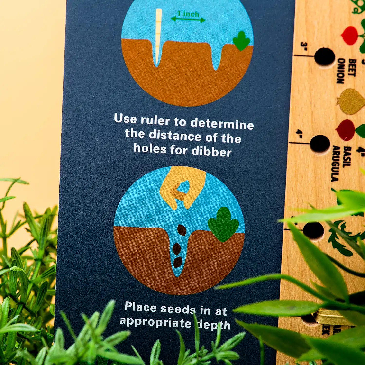 Een handige houden tool voor het op de juiste afstand en diepte zaaien van zaadjes voor in je moestuin. Hiermee zaai je nooit te diep of te dicht bij elkaar. Hij bevat de meest gangbare groenten, zoals wortel, doperwten, uien, radijs, prei en knoflook.