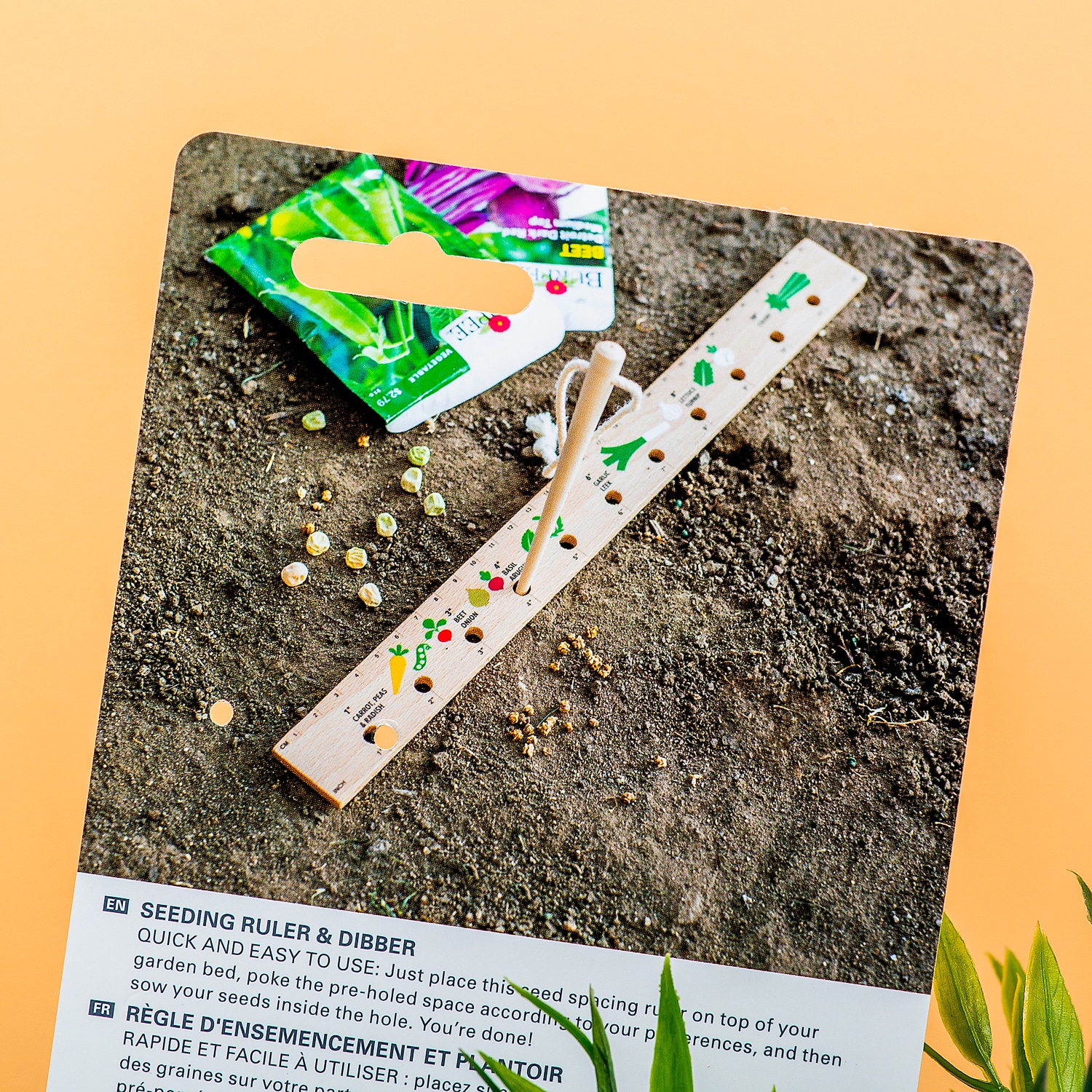 Een handige houden tool voor het op de juiste afstand en diepte zaaien van zaadjes voor in je moestuin. Hiermee zaai je nooit te diep of te dicht bij elkaar. Hij bevat de meest gangbare groenten, zoals wortel, doperwten, uien, radijs, prei en knoflook.