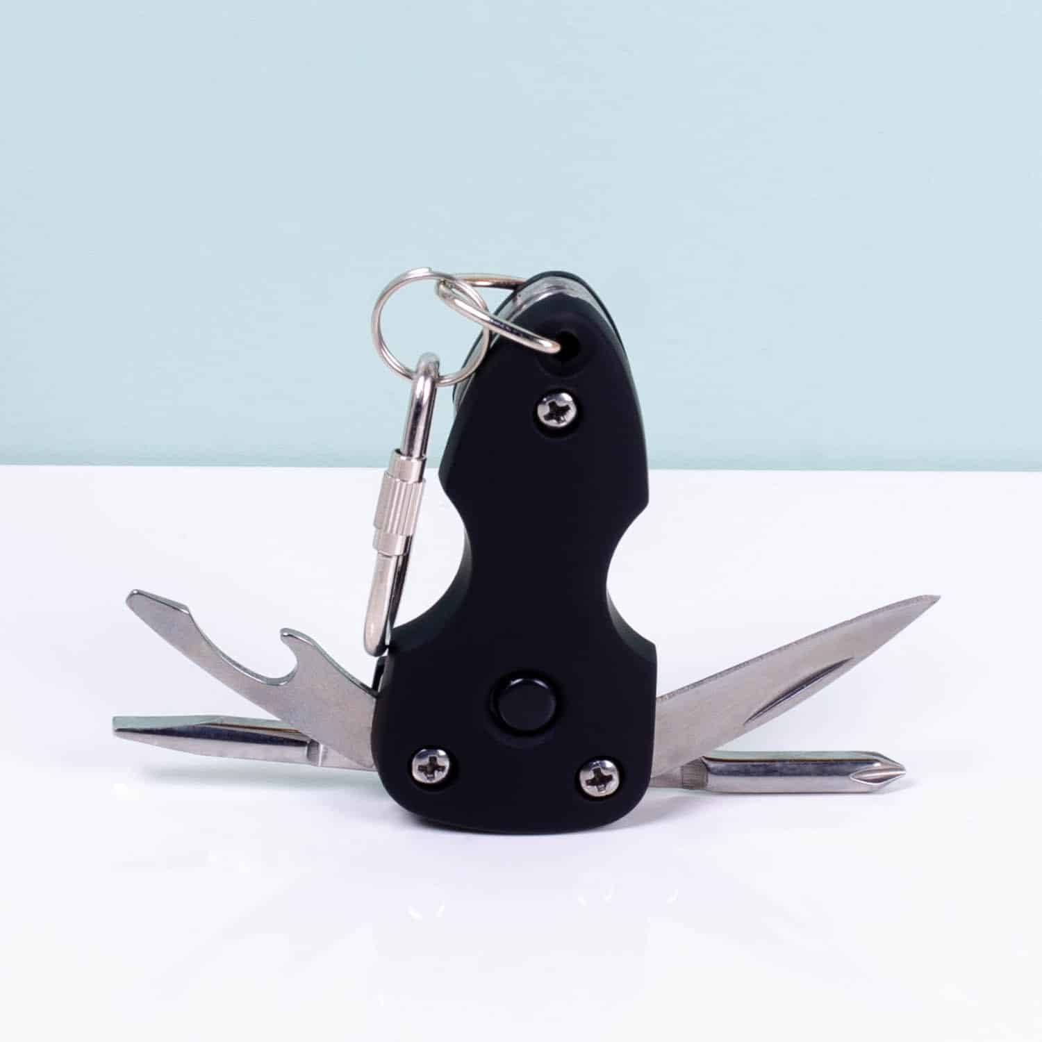 Een handige multitool voor onderweg, met onder andere een zaklamp en mesje. Daarnaast bevat de multitool schroevendraaiers en een flesopener. Met de karabijnhaak hang je hem makkelijk aan je tas, broek of sleutelbos, zodat je de multitool altijd bij je hebt.
