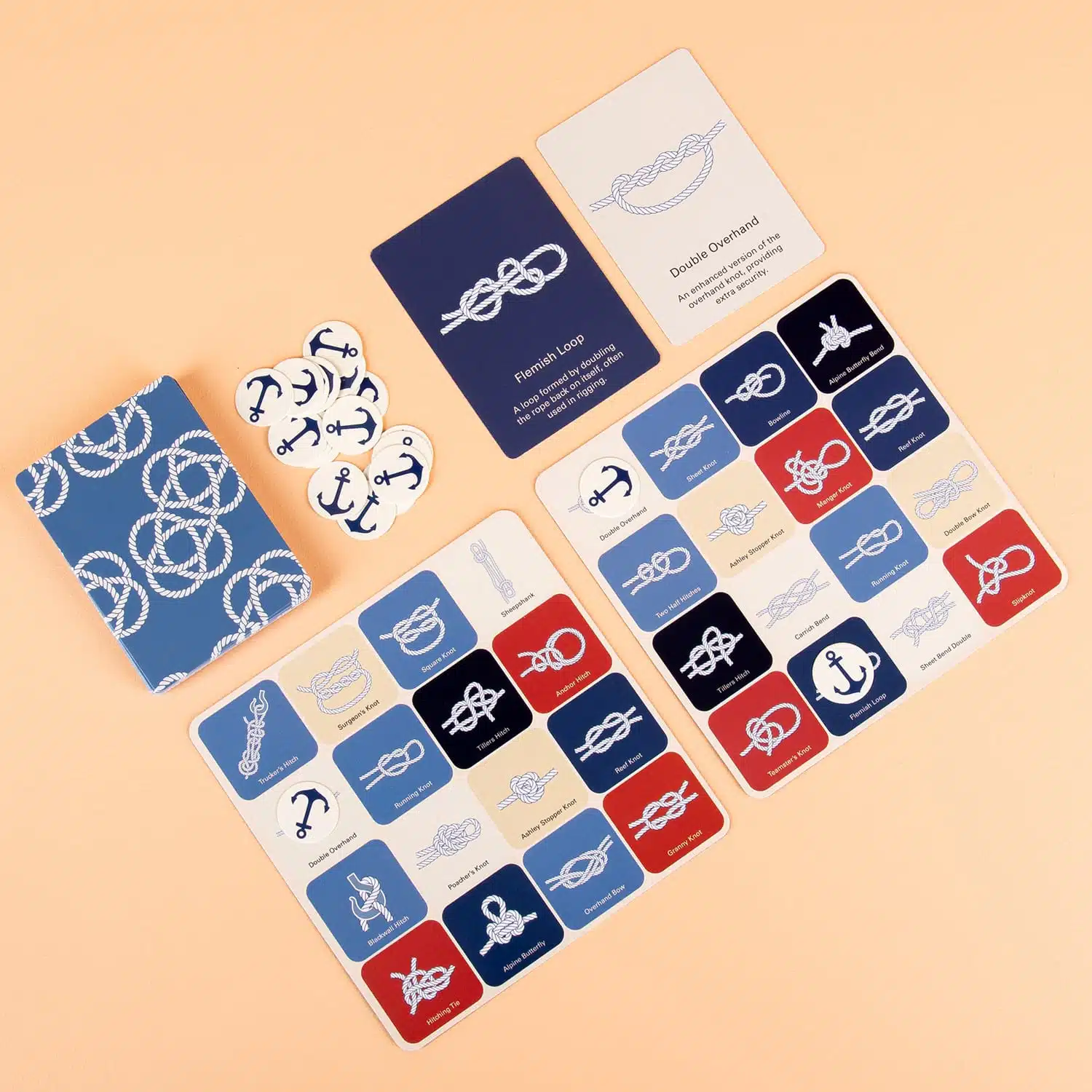 Vergeet de saaie nummers: jij speelt voortaan bingo met knopen. Niet de knopen aan je jas, maar echte zeilknopen en steken. De spelleider trekt een kaart, die jij moet zoeken op je kaart. Heb je hem, dan leg je er een spelstuk met anker op. Wie als eerste zijn kaart vol heeft, wint. En je weet wat er gebeurt als je te vroeg bingo roept… Dan moet je zingen!
